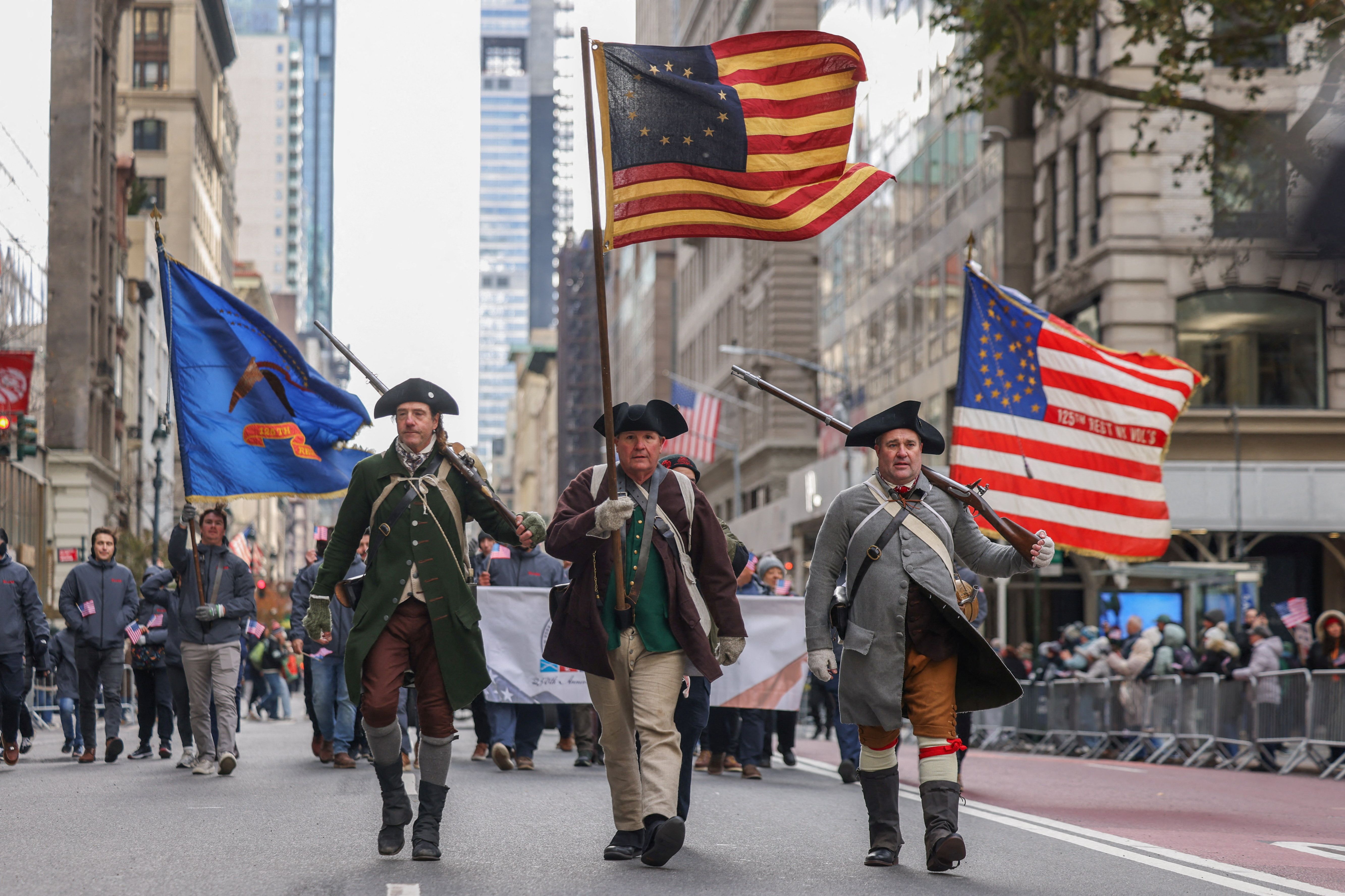 People in colonial clothing march in the Veterans Day parade on Fifth Avenue in Manhattan, New York City on November 11, 2025. (Photo by Kylie Cooper/Reuters)