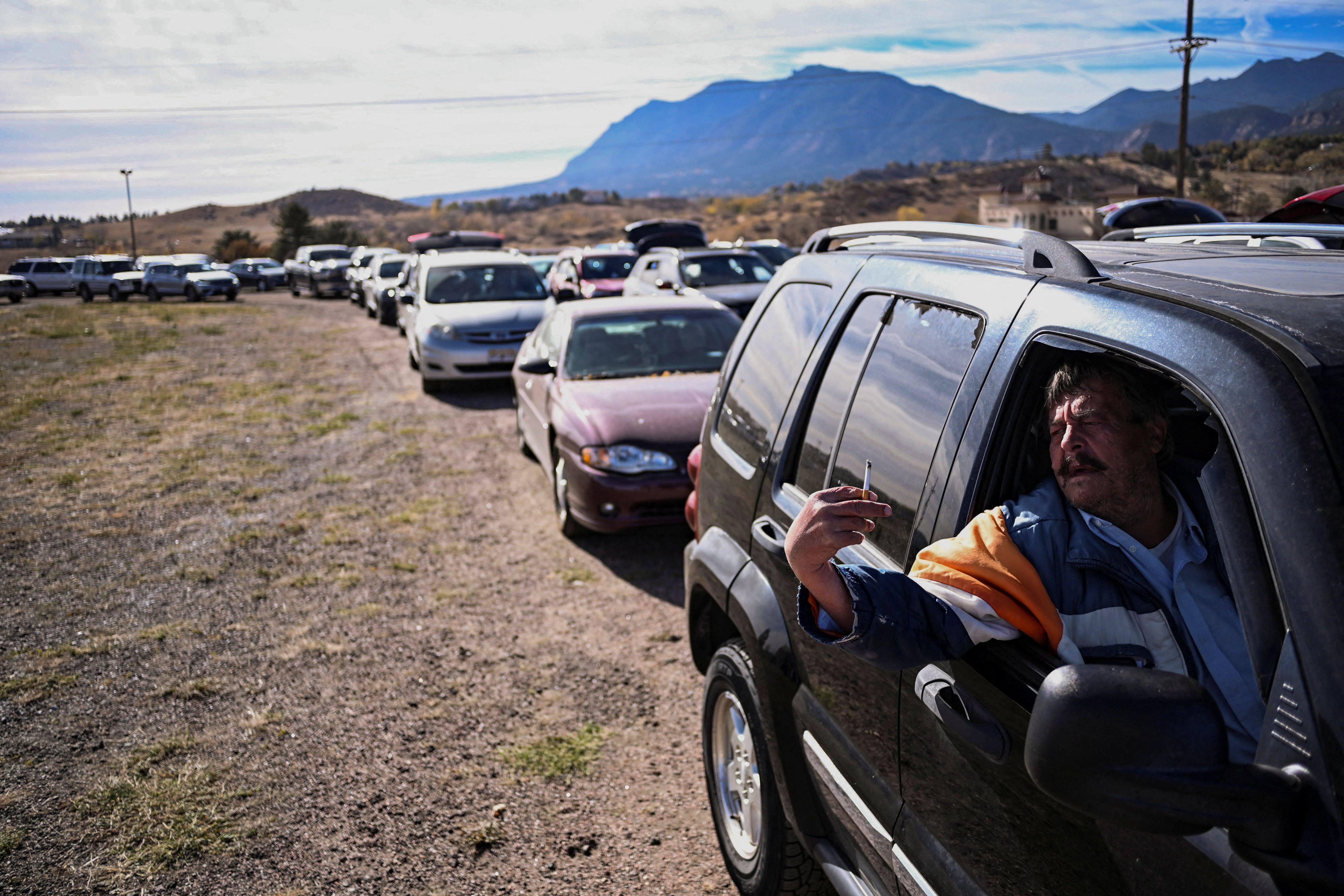 Randy Binder smokes a cigarette while waiting for hours in a queue of more than 100 cars at the Mt. Carmel Veterans Service Center food distribution site in Colorado Springs, Colorado, on November 7, 2025. (Photo by Mark Makela/Reuters)