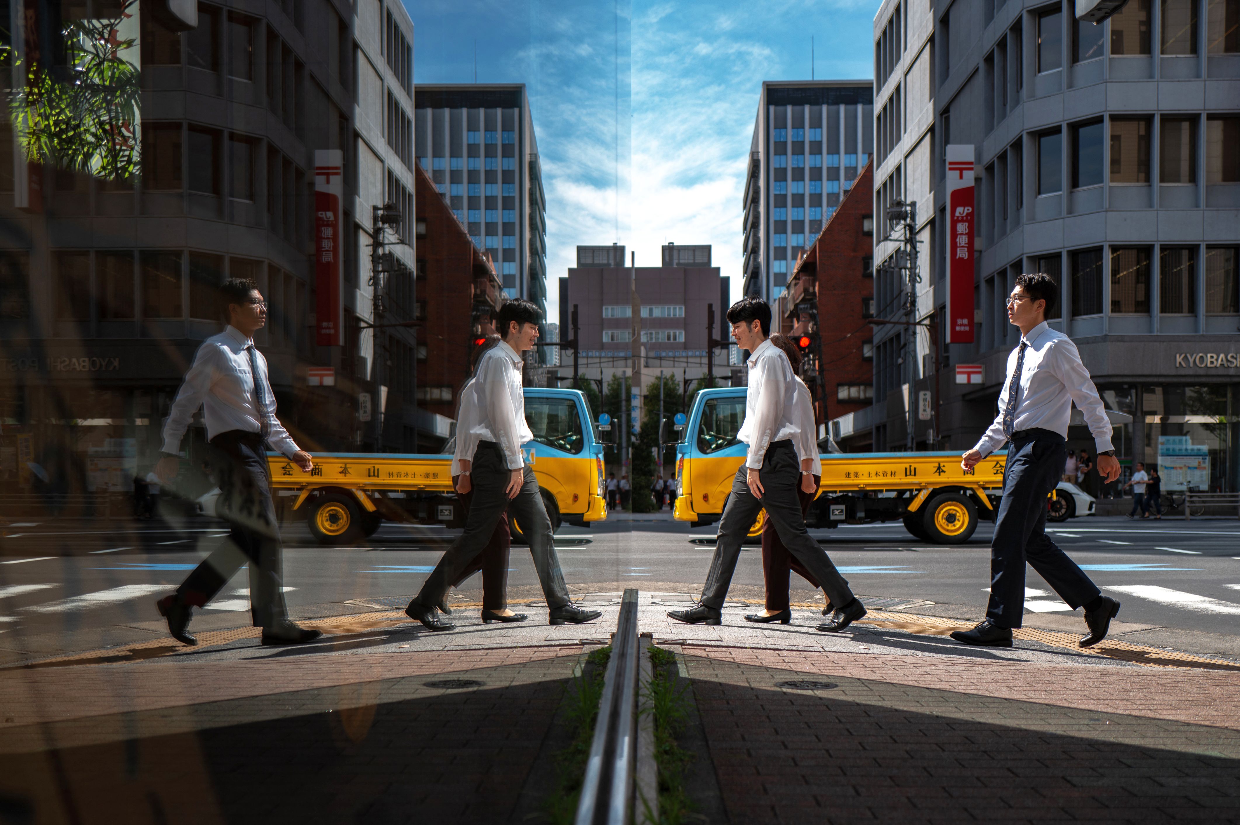 Pedestrians are seen reflected in glass as they walk in the Ginza district of Tokyo on October 8, 2025. (Photo by Philip Fong/AFP Photo)