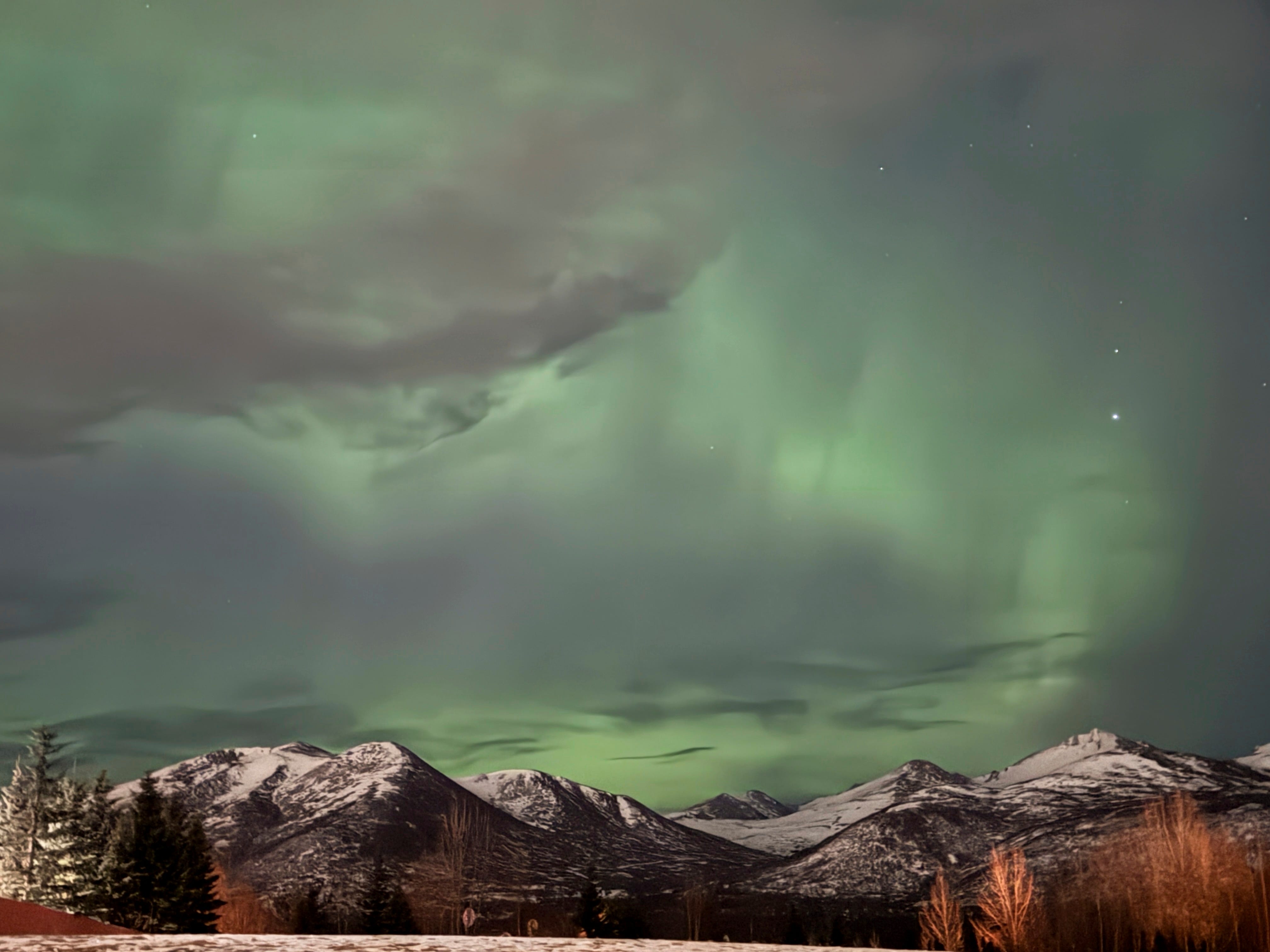 The northern lights appear over the Chugach Mountains on the eastern edge of Anchorage, Alaska, on Monday, March 24, 2025. (Photo by Mark Thiessen/AP Photo)