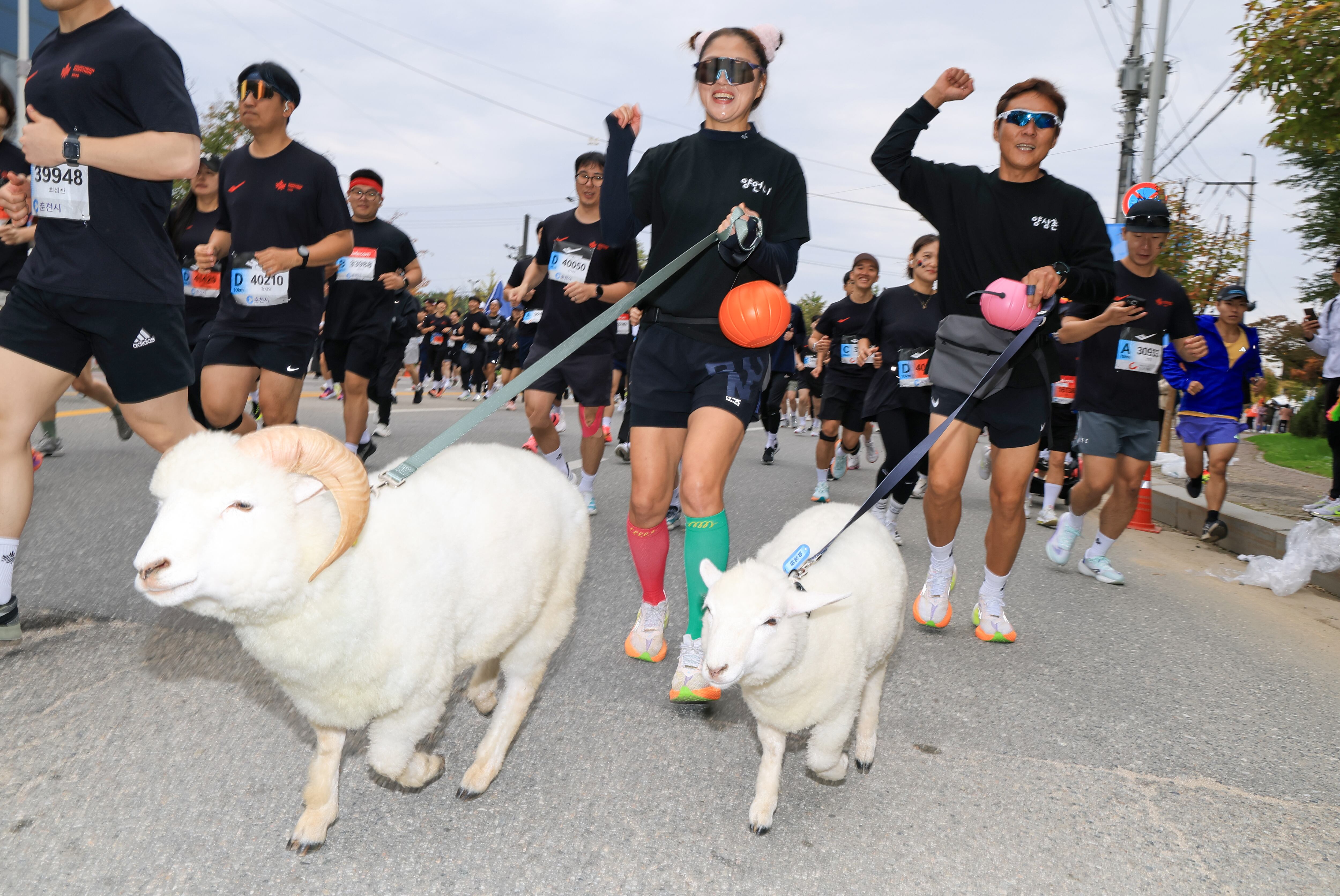 Participants in the 2025 Chosun Ilbo Chuncheon Marathon, held in Chuncheon, Gangwon Province, on the morning of the October 26, 2025, run along the starting line with sheep. (Photo by Park Seong-won)