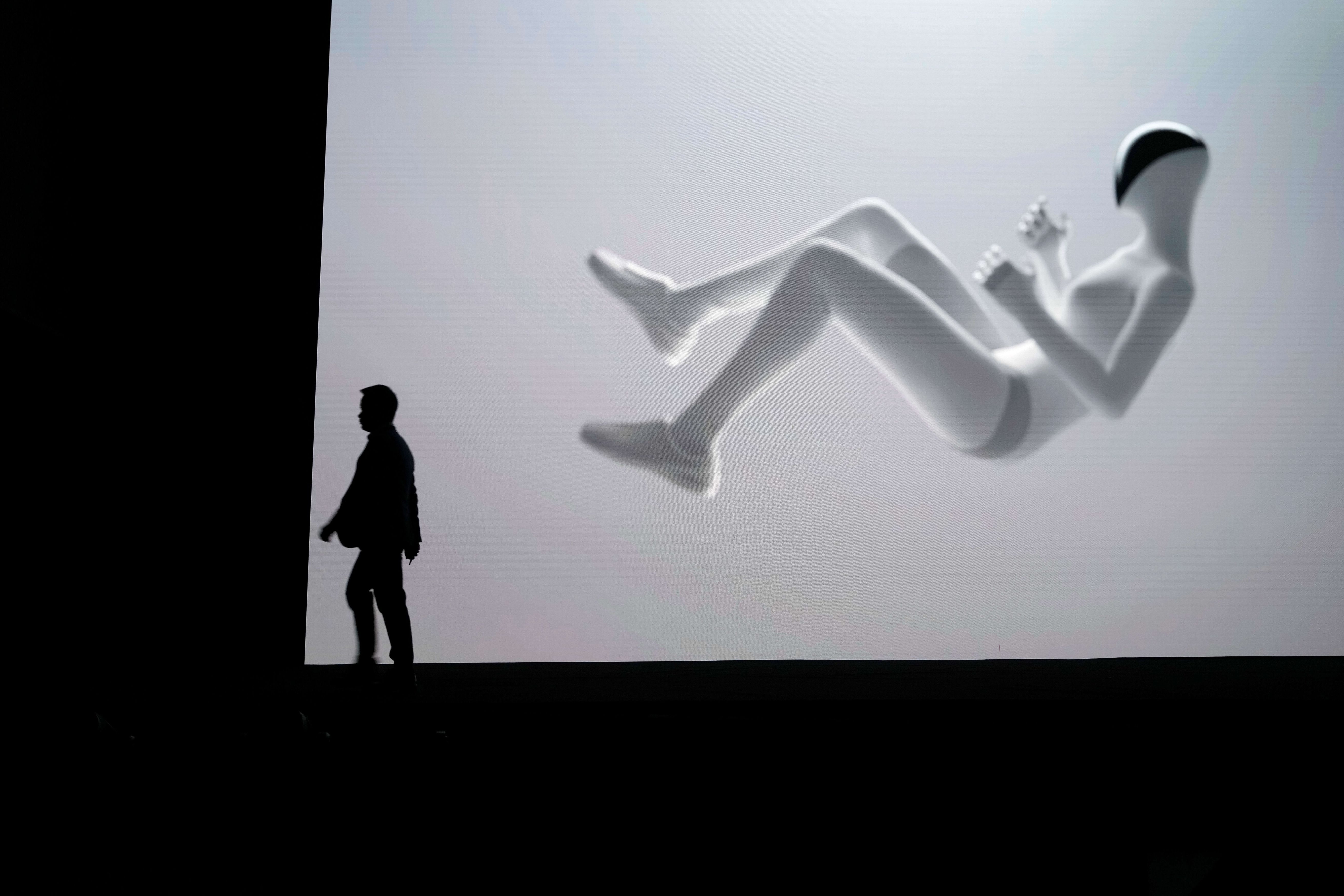 He Xiaopeng, Chairman and CEO of XPENG walks past a video showing the company's next generation IRON robot during the XPENG AI Day held at the company headquarters in Guangzhou in southern China's Guangdong province, Wednesday, November 5, 2025. (Photo by Ng Han Guan/AP Photo)