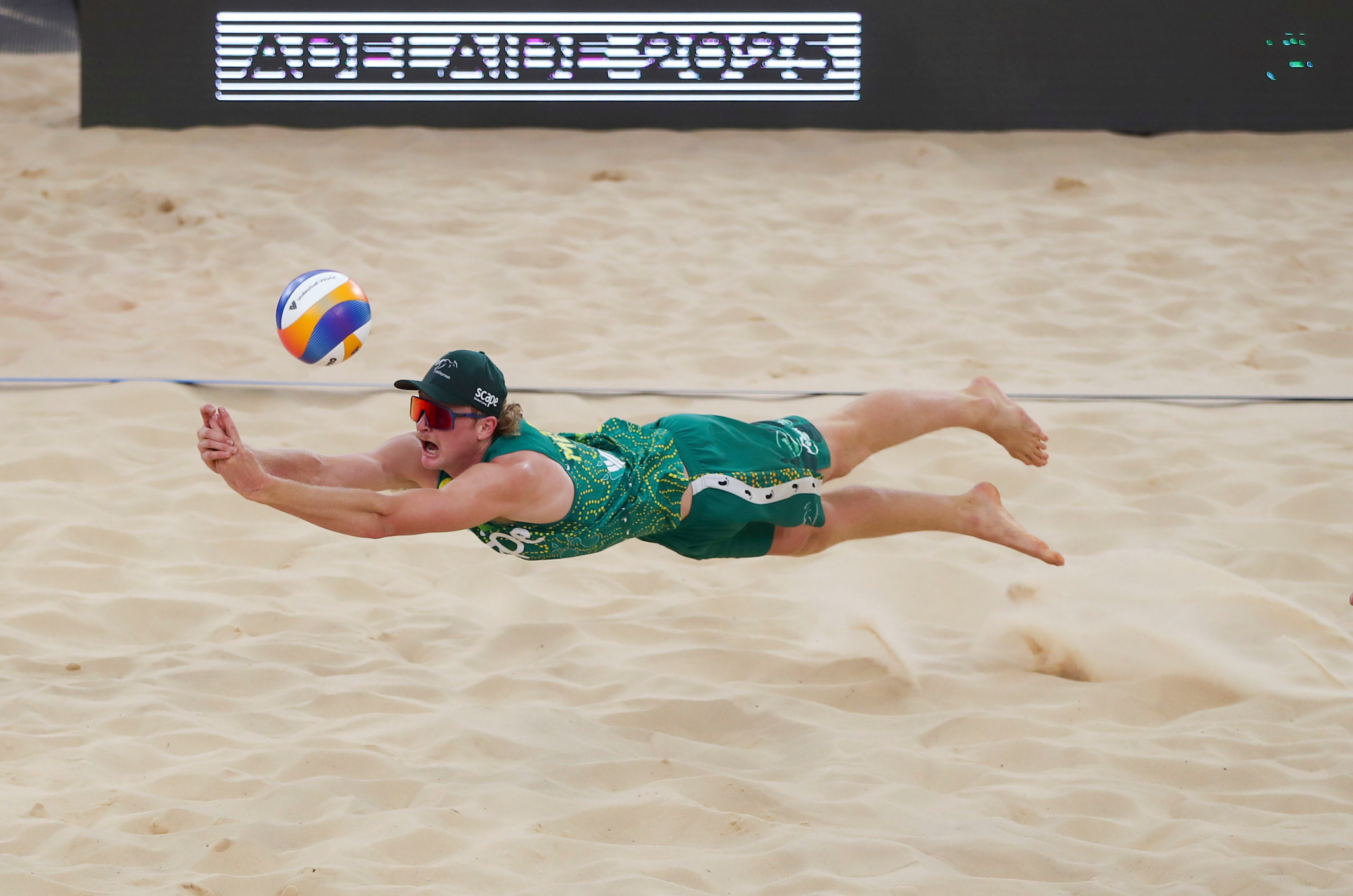 Oliver Merritt and Ben Hood of Australia in action against Jacob Holting Nilsson and Elmer Andersson of Sweden during The Beach Volleyball World Championships at Pinky Flat in Adelaide, Australia, 14 November 2025. (Photo by Matt Turner/EPA)