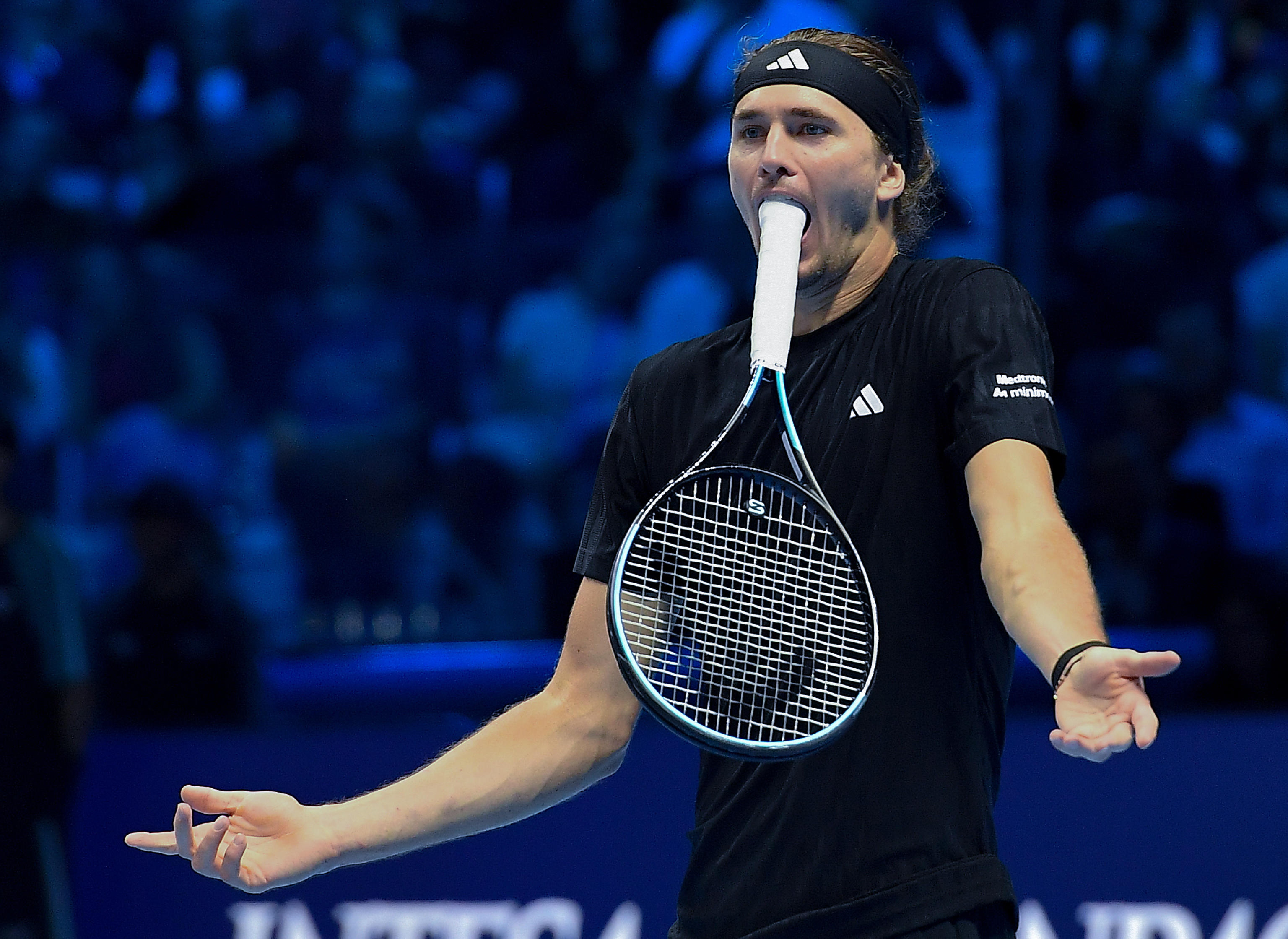 Alexander Zverev of Germany gestures to the chair umpire during the Singles Round Robin match against Jannik Sinner of Italy at the ATP Finals in Turin, Italy, 12 November 2025. (Photo by Alessandro Di Marco/EPA)
