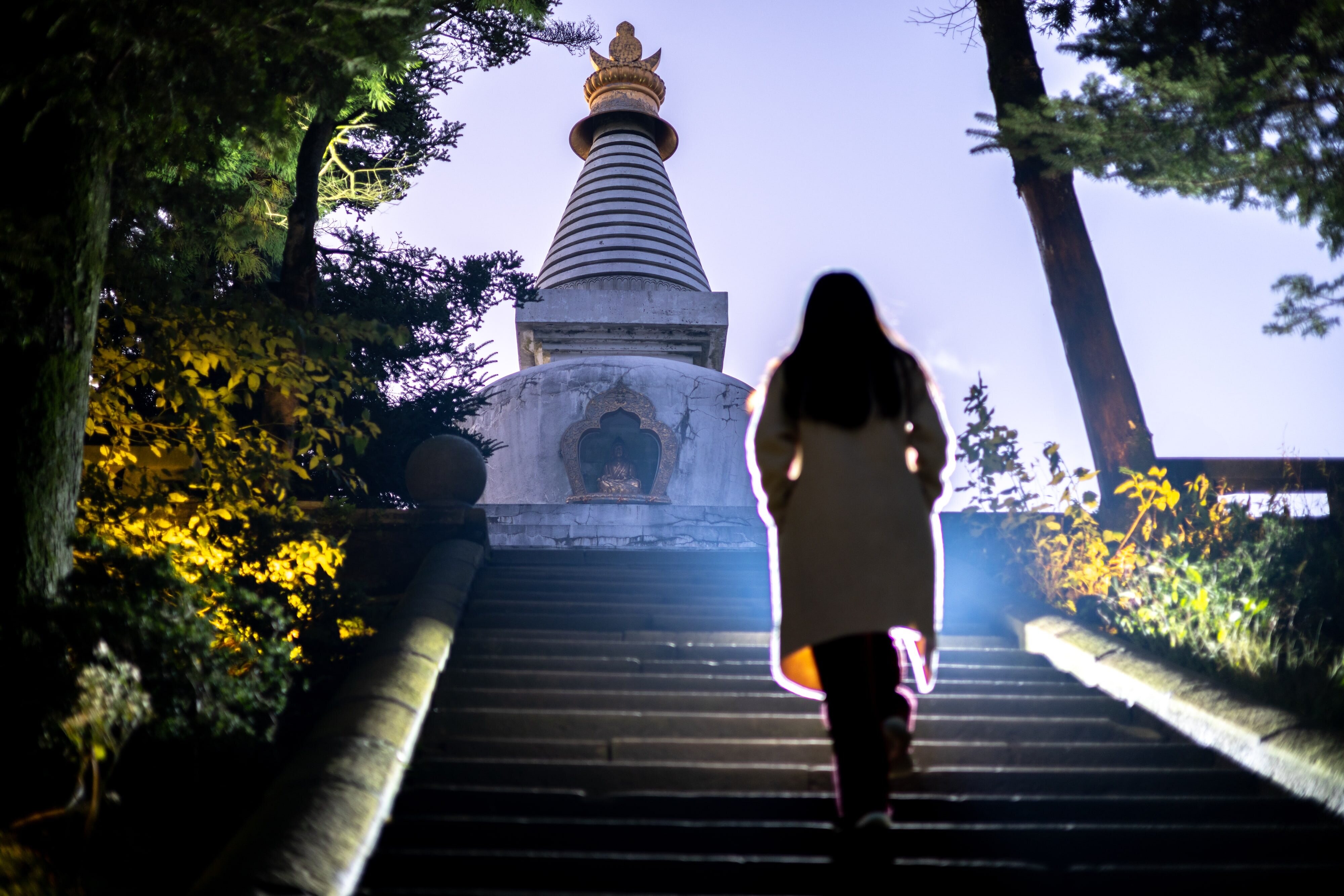 A woman walks up stairs to a stuppa on LuShan mountain in Jiangxi, China on Wednesday, October 22, 2025. (Photoby Dan Sandoval/AP Content Services for Lushan Tourism)