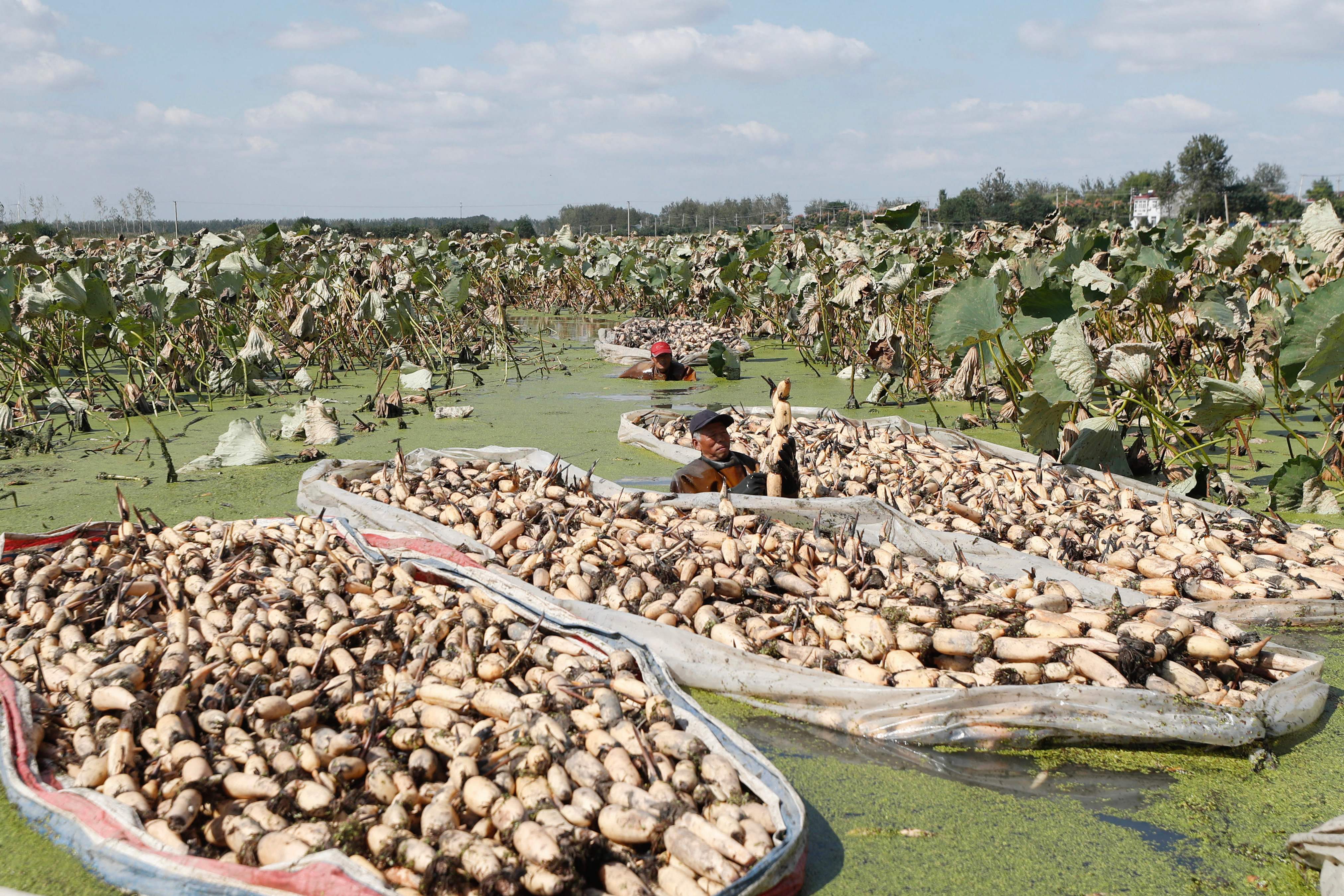 Farmers harvest lotus roots in Huaian in China's eastern Jiangsu province on October 22, 2025. (Photo by AFP Photo/China Stringer Network)