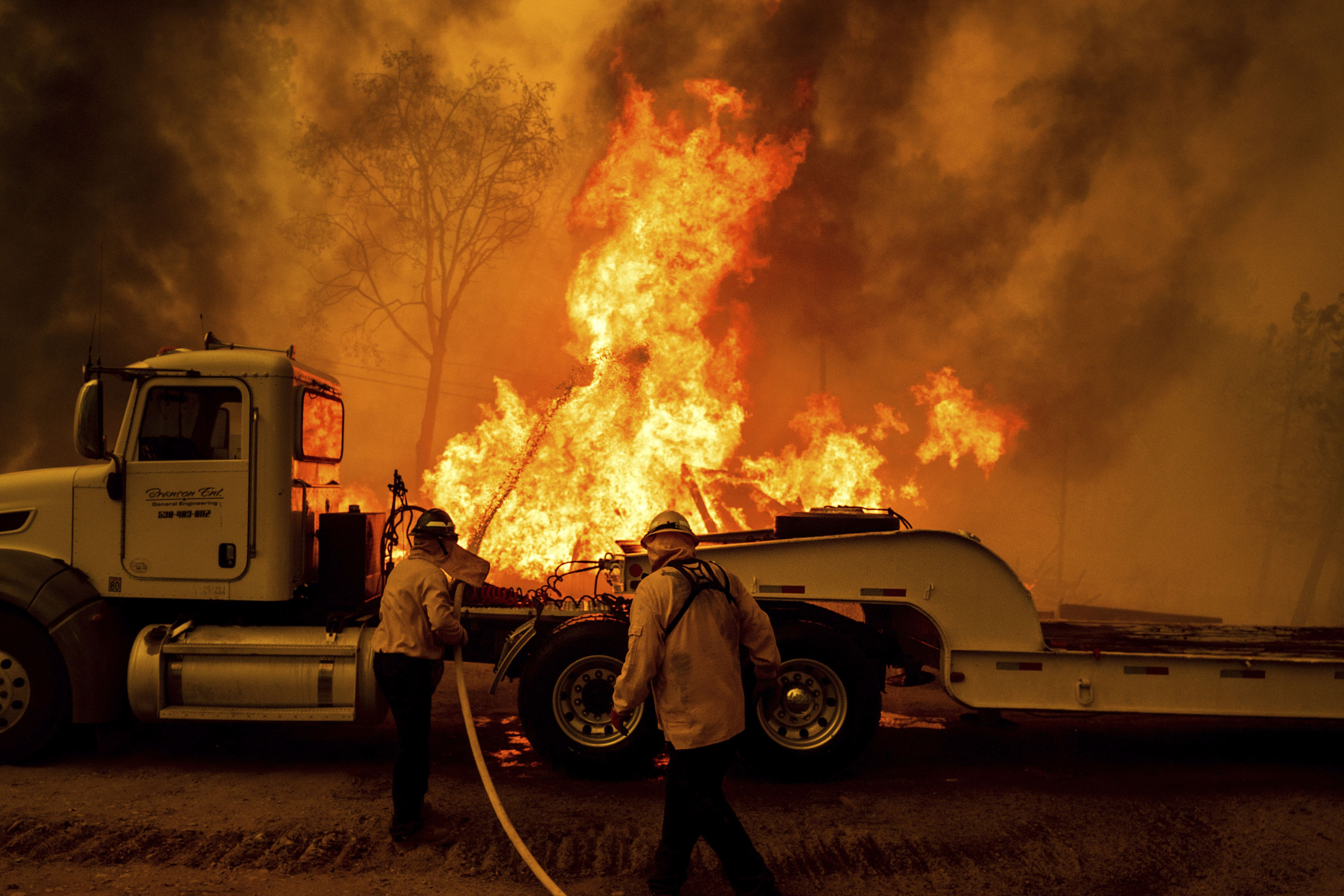 Firefighters spray water as the Park Fire tears though the Cohasset community in Butte County, Calif., on Thursday, July 25, 2024. (Photo by Noah Berger/AP Photo)