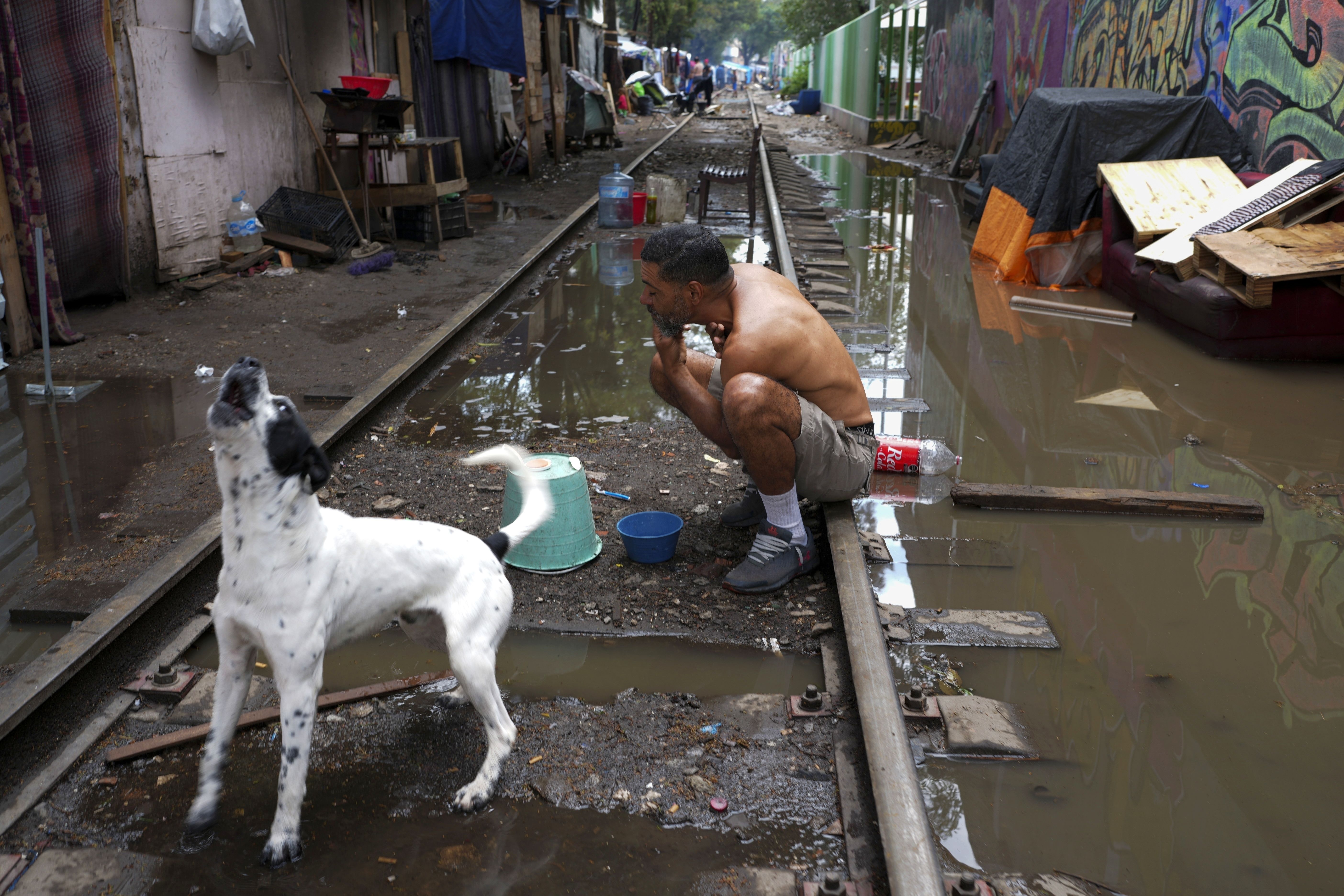A dog howls as Venezuelan migrant Ali Gomez sits on a railroad track while shaving at a migrant camp in Mexico City, July 18, 2024. (Photo by Marco Ugarte/AP Photo)