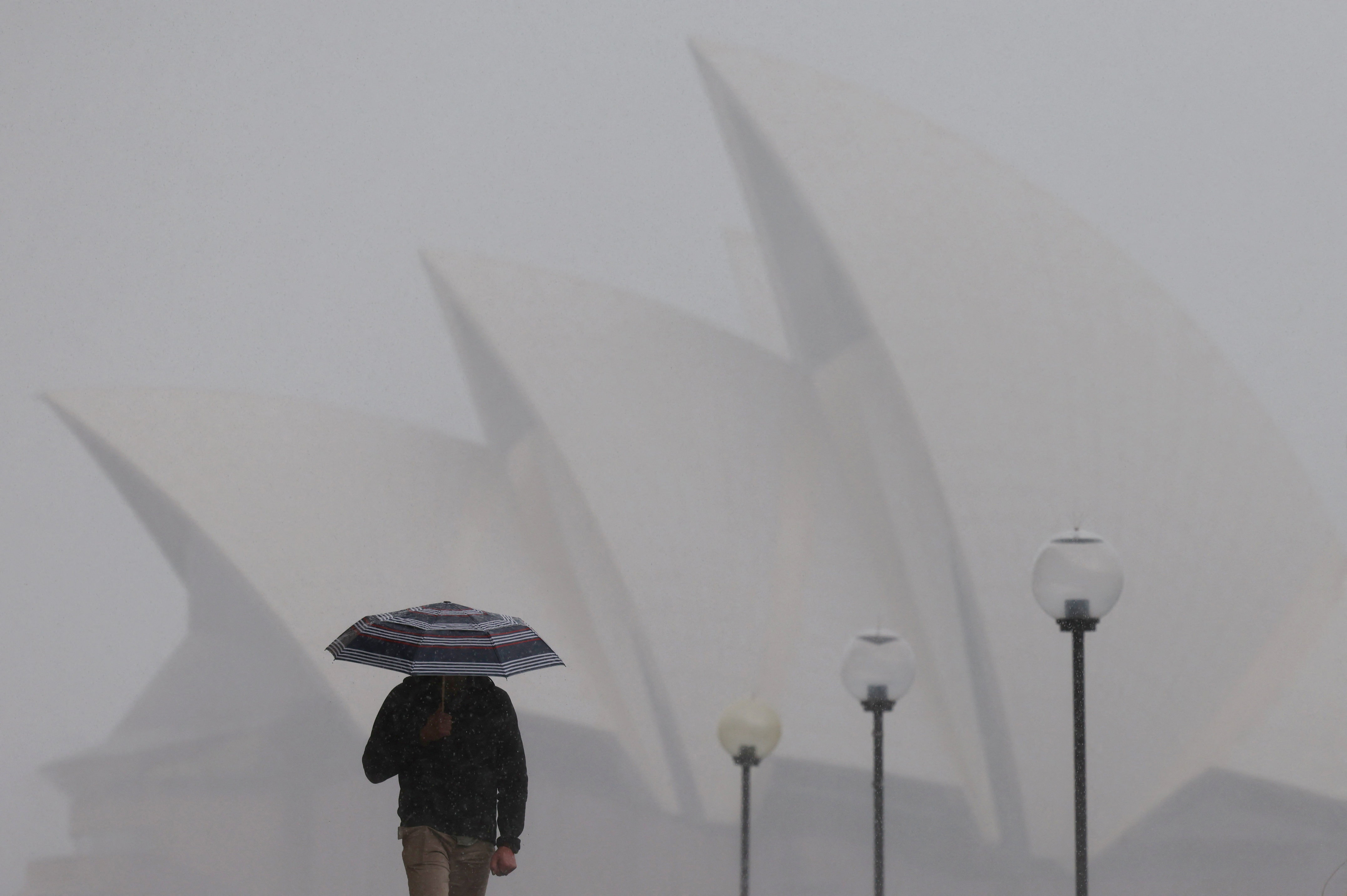 A person carrying an umbrella shelters from the rain as they walk past the Sydney Opera House in Sydney, Australia, on August 21, 2025. (Photo by Hollie Adams/Reuters)