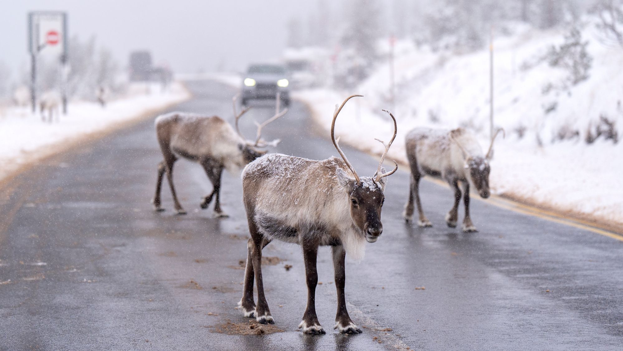 Reindeer stop traffic on the road near Aviemore on Wednesday, November 19, 2025. The Cairngorm Reindeer Herd is Britain's only free-ranging herd of reindeer found in the Cairngorm mountains in the Scottish Highlands. Snow and ice warnings have come into force across the UK, as the Met Office said the wintry weather “could create some particularly tricky travel conditions”. (Photo by Jane Barlow/PA Images via Getty Images)
