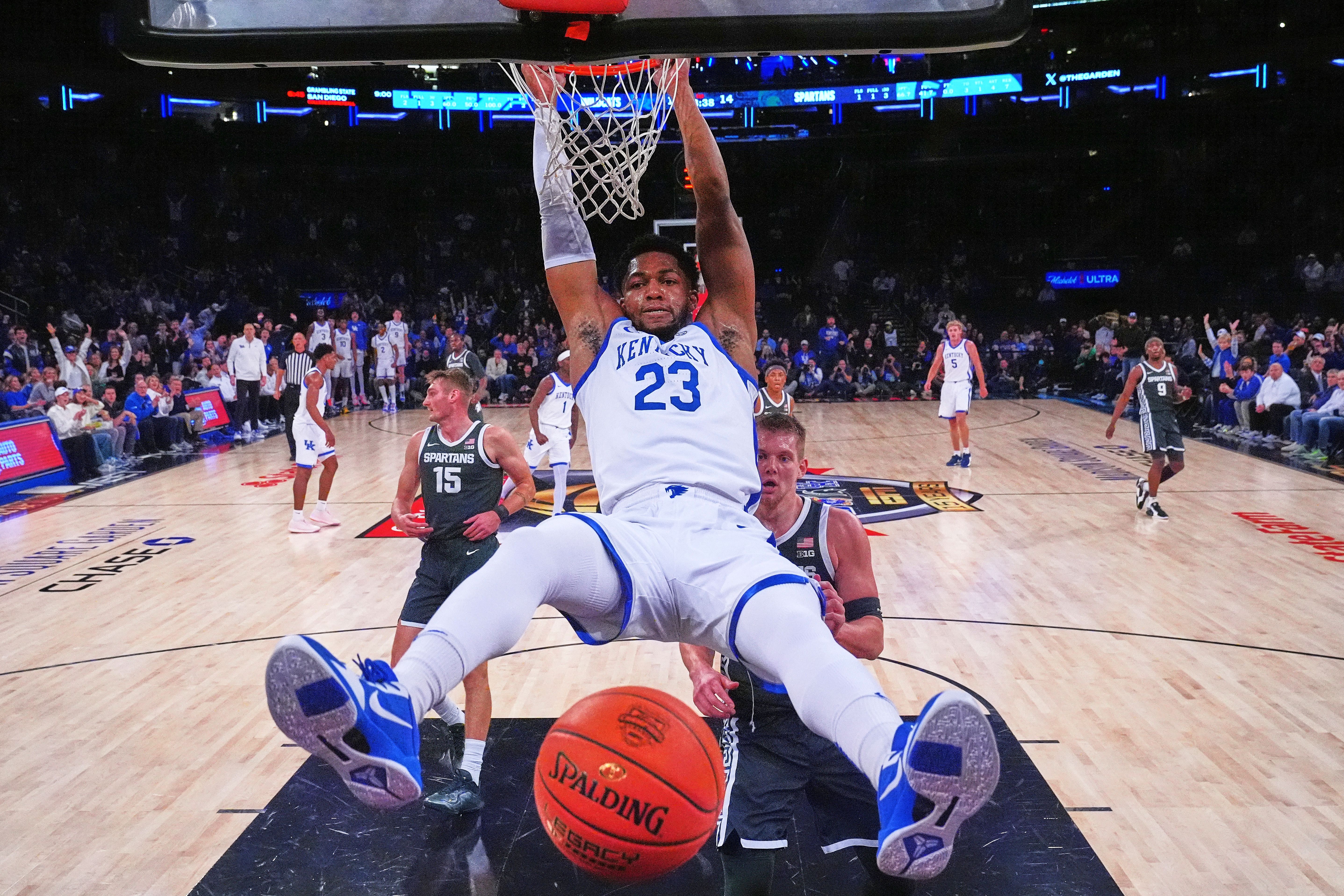 Kentucky's Mouhamed Dioubate, center, dunks the ball in front of Michigan State's Jaxon Kohler, right, and Carson Cooper, left, during the first half of an NCAA college basketball game Tuesday, November 18, 2025, in New York. (Photo by Frank Franklin II/AP Photo)