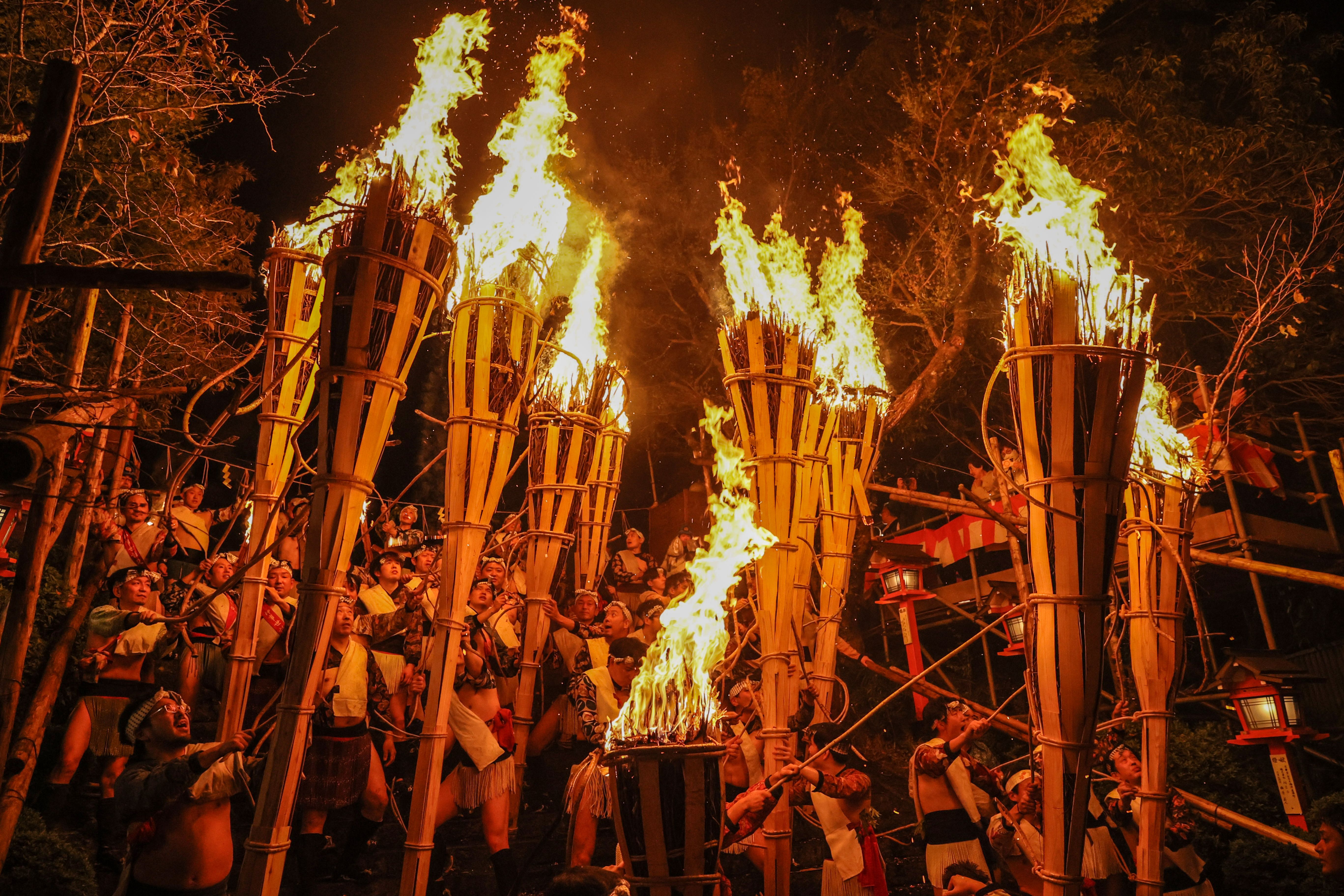 Participants carry large torches during the Kurama Fire Festival on October 22, 2025 in Kyoto, Japan. (Photo by The Asahi Shimbun via Getty Images)
