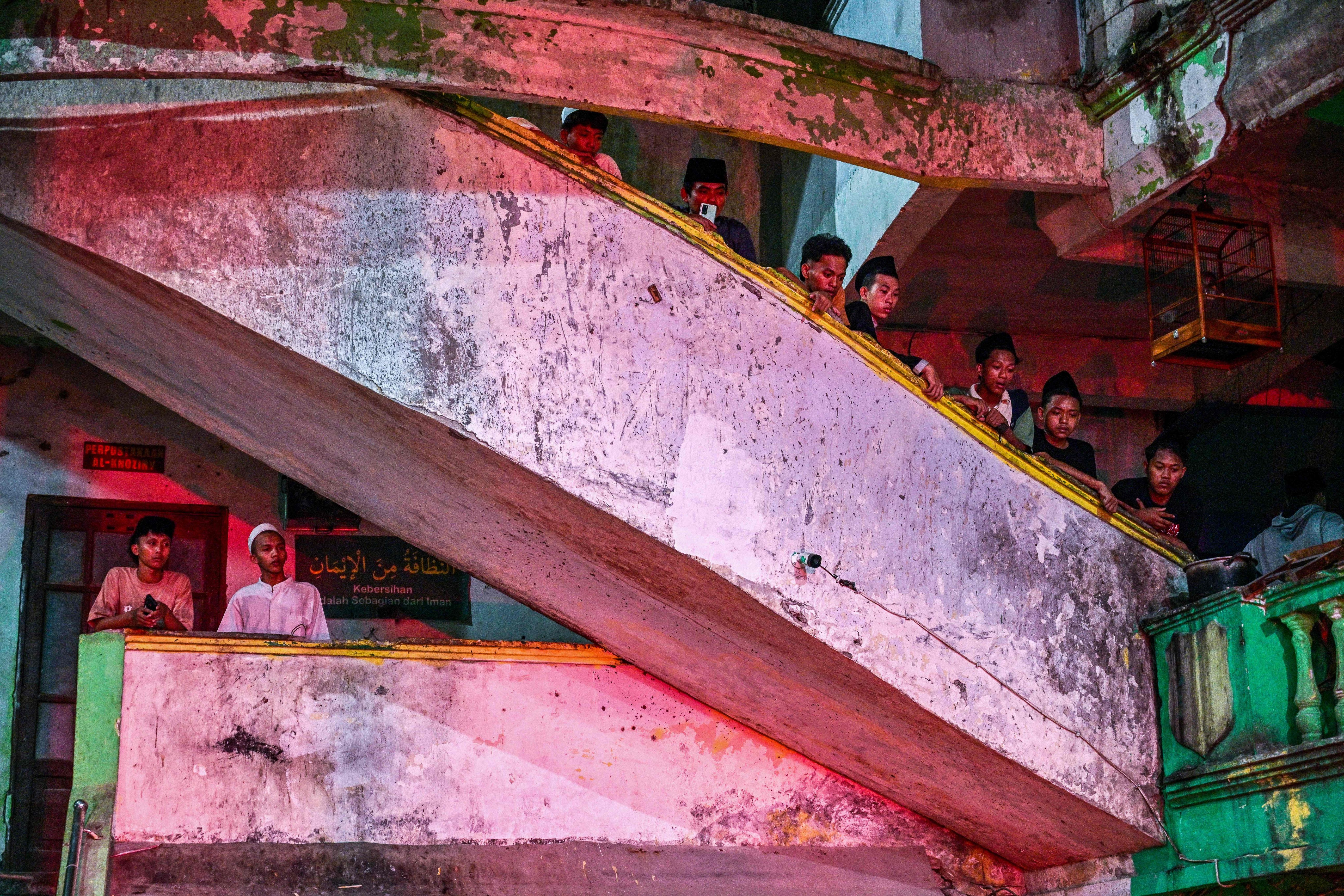 Students watch as rescue personnel search for survivors after a building collapsed at an Islamic boarding school in Sidoarjo, East Java province on September 29, 2025, injuring a number of students and trapping several others under the rubble. (Photo by Juni Kriswanto/AFP Photo)