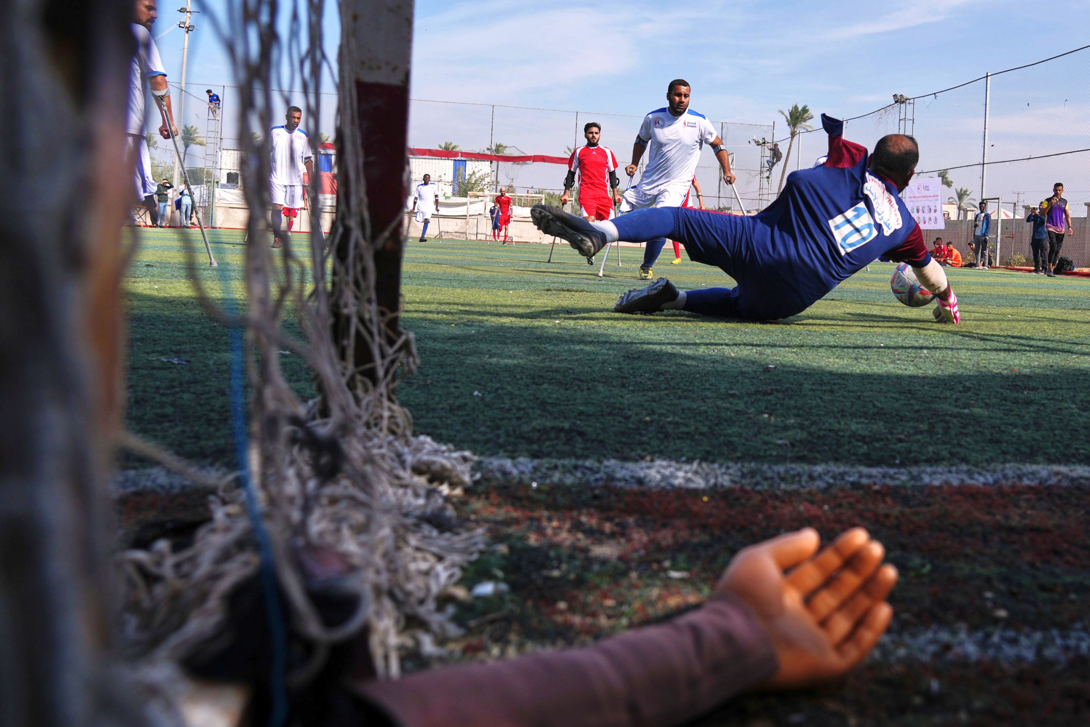 Palestinians, some of whom were injured in the Hamas-Israel conflict and some in previous conflicts, compete in a soccer tournament for amputees in Deir al-Balah, Gaza, on Monday, November 17, 2025. (Photo by Jehad Alshrafi/AP Photo)