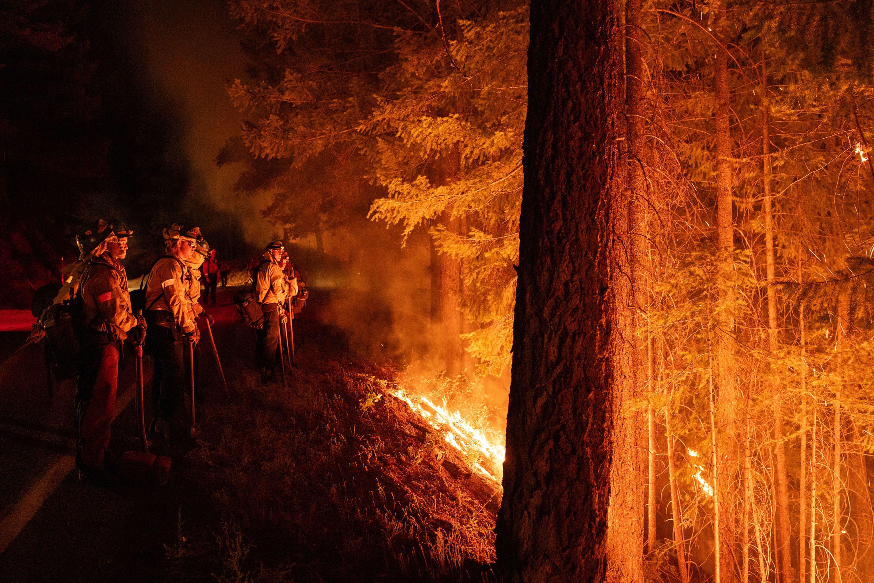 Firefighters monitor a controlled burn set along Highway 32 near Chico, California, on Monday, July 29, 2024. They were trying to reduce fuel for the Park Fire, which is now the fifth-largest wildfire in state history. (Photo by Loren Elliott/The New York Times/Redux)