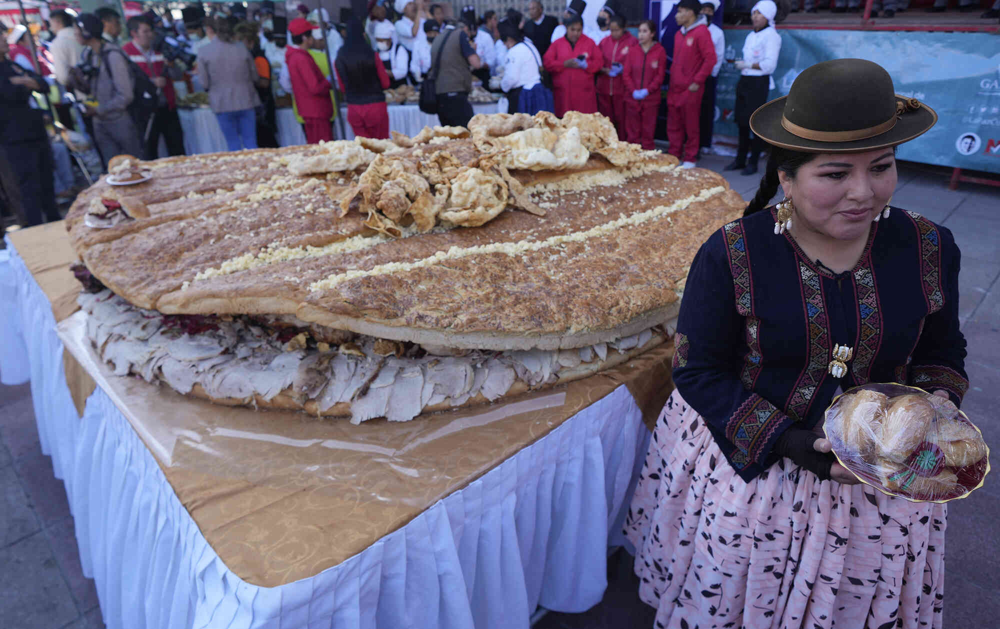 Cholita Eliana Paco poses for a photo during the presentation of a giant “sandwich de chola”, in La Paz, Bolivia, Tuesday, July 2, 2024. Gastronomy experts and student chefs prepared the traditional Bolivian roasted pork sandwich in hopes of breaking the world's record for largest sandwich. (Photo by Juan Karita/AP Photo)