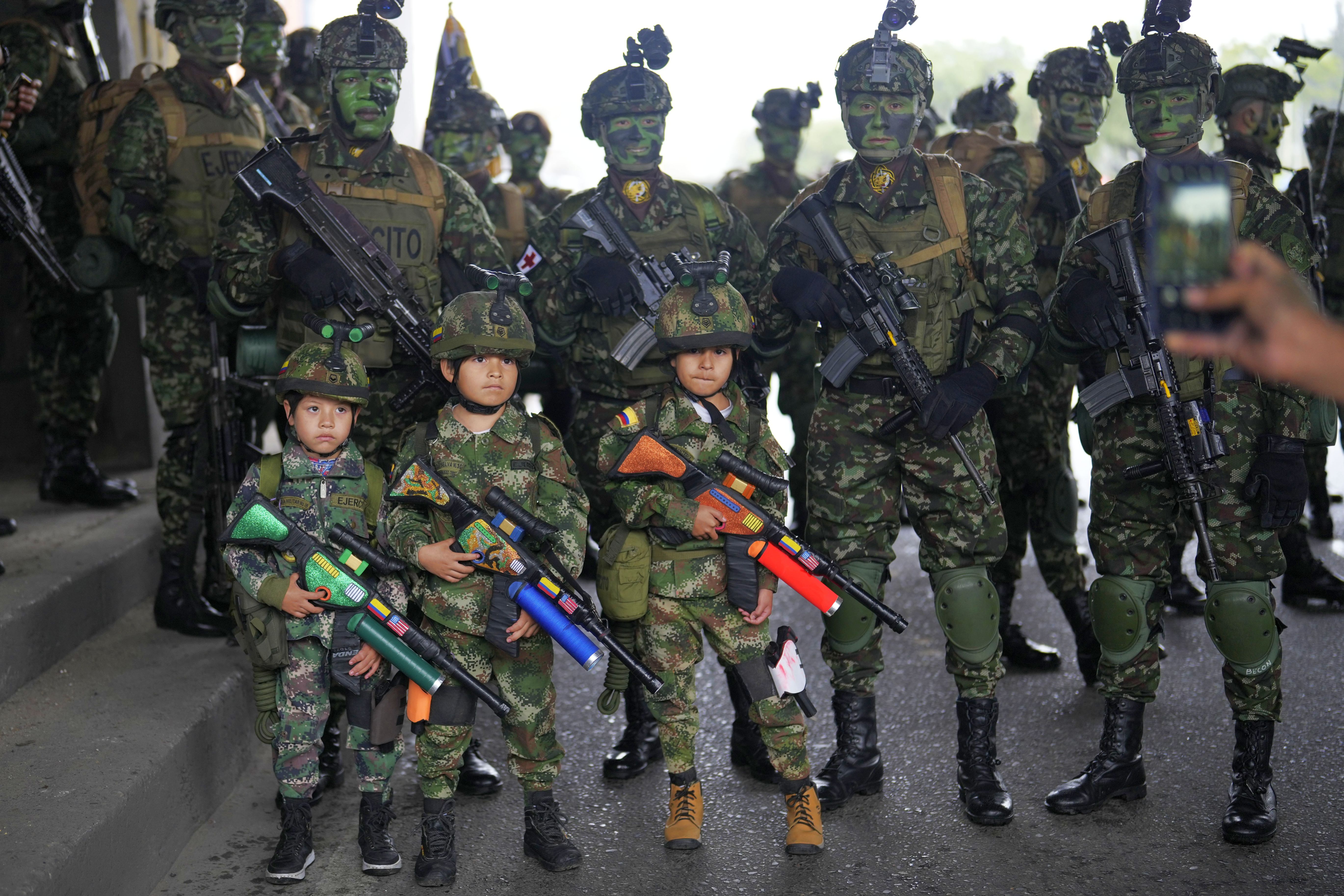 Boys dressed as soldiers pose for a photo during the Independence Day military parade, in Bogota, Colombia, Saturday, July 20, 2024. Colombia is marking 214 years of independence from Spain. (Photo by Fernando Vergara/AP Photo)