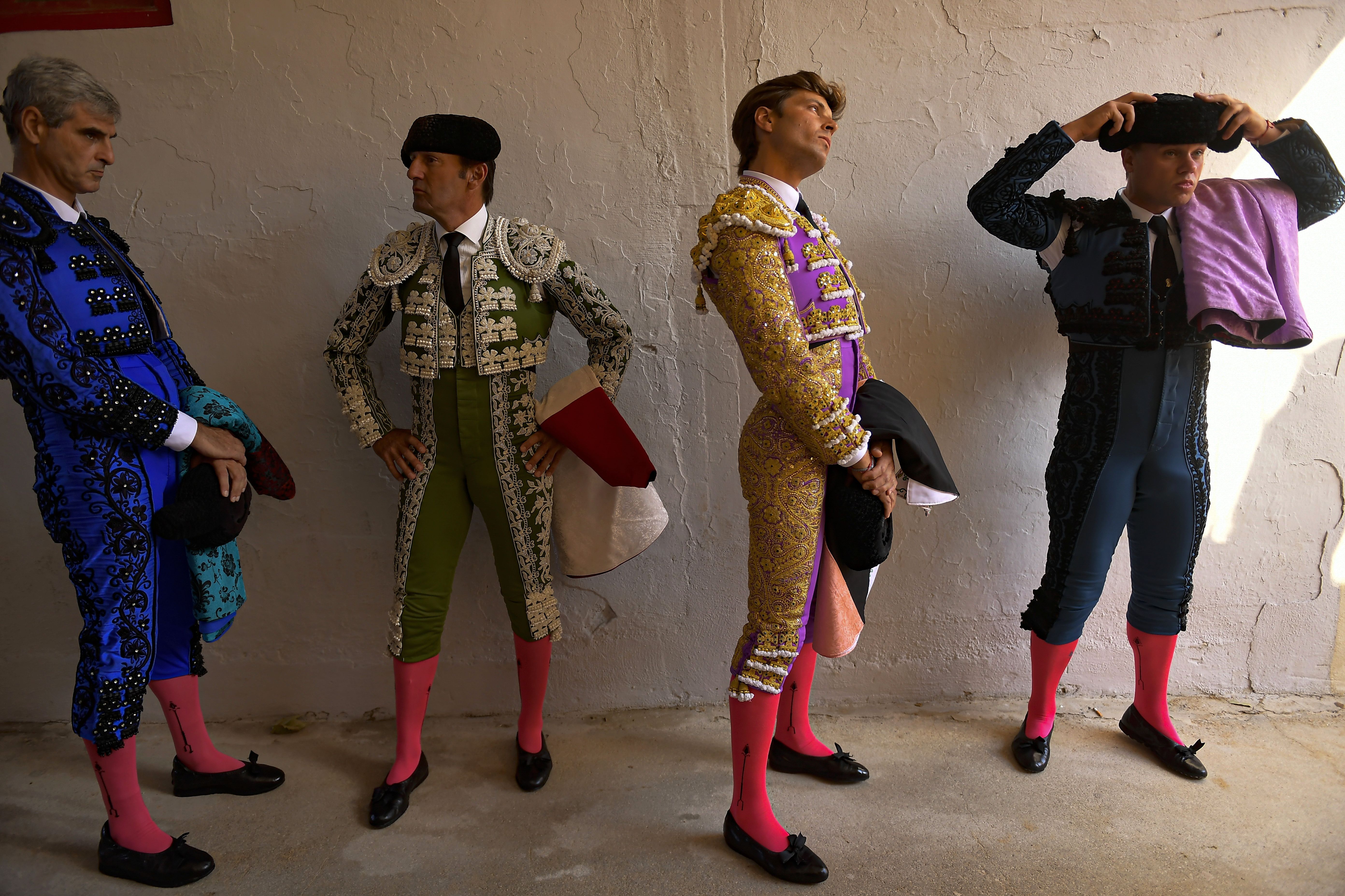 Spanish bullfighter Juan Leal, second right, with his assistants before entering the bullfight at the San Fermín fiesta in Pamplona, Spain, Monday, July 8, 2024. (Photo by Alvaro Barrientos/AP Photo)