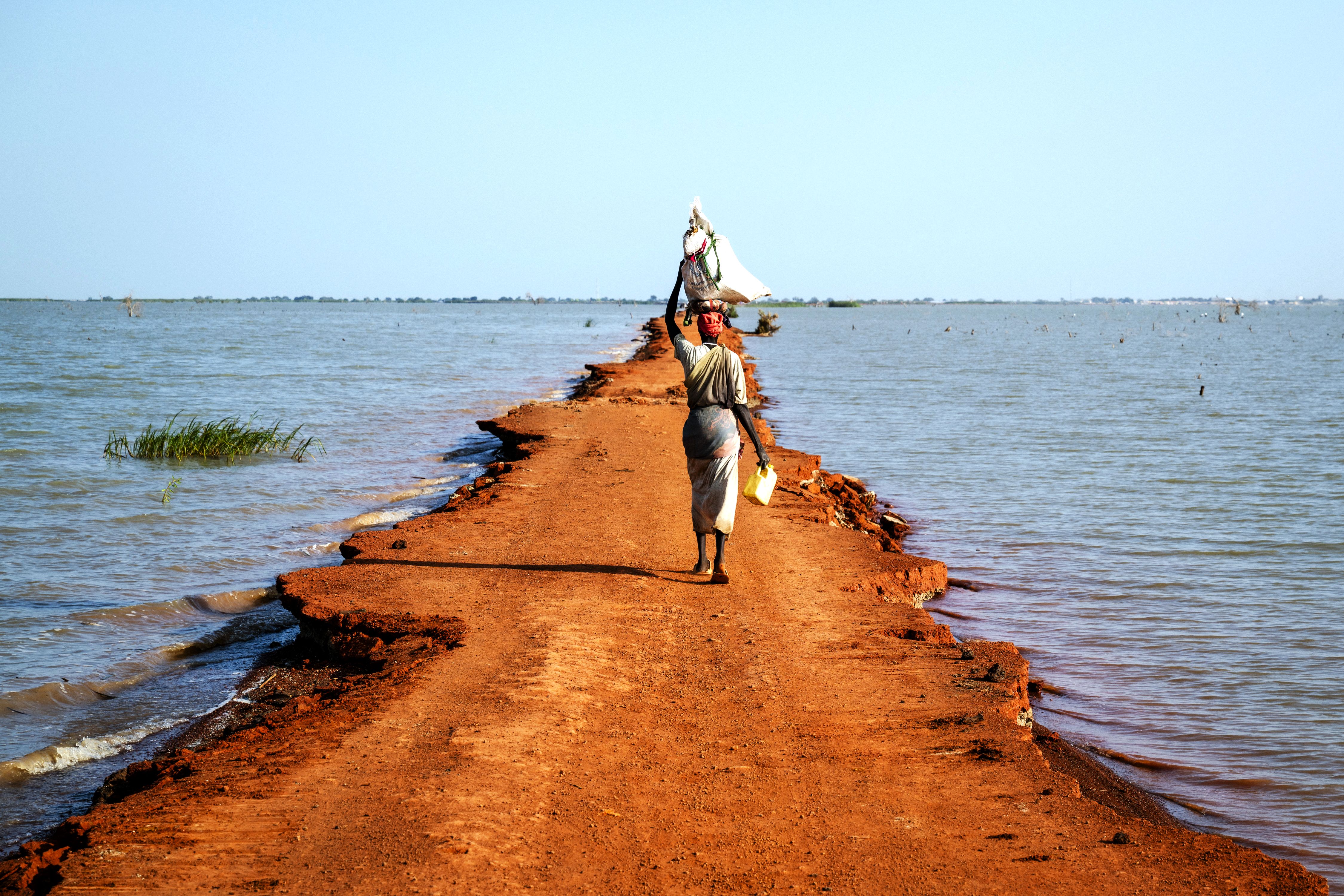 A woman carries a heavy load on her head while walking along the narrow Kilo ZeroKilo 30 road near Bentiu in Unity State, South Sudan, on November 6, 2025. The eroded and flood-affected road compels residents to travel long distances on foot to access supplies in Bentiu and Rubkona. (Photo by Rian Cope/AFP Photo)