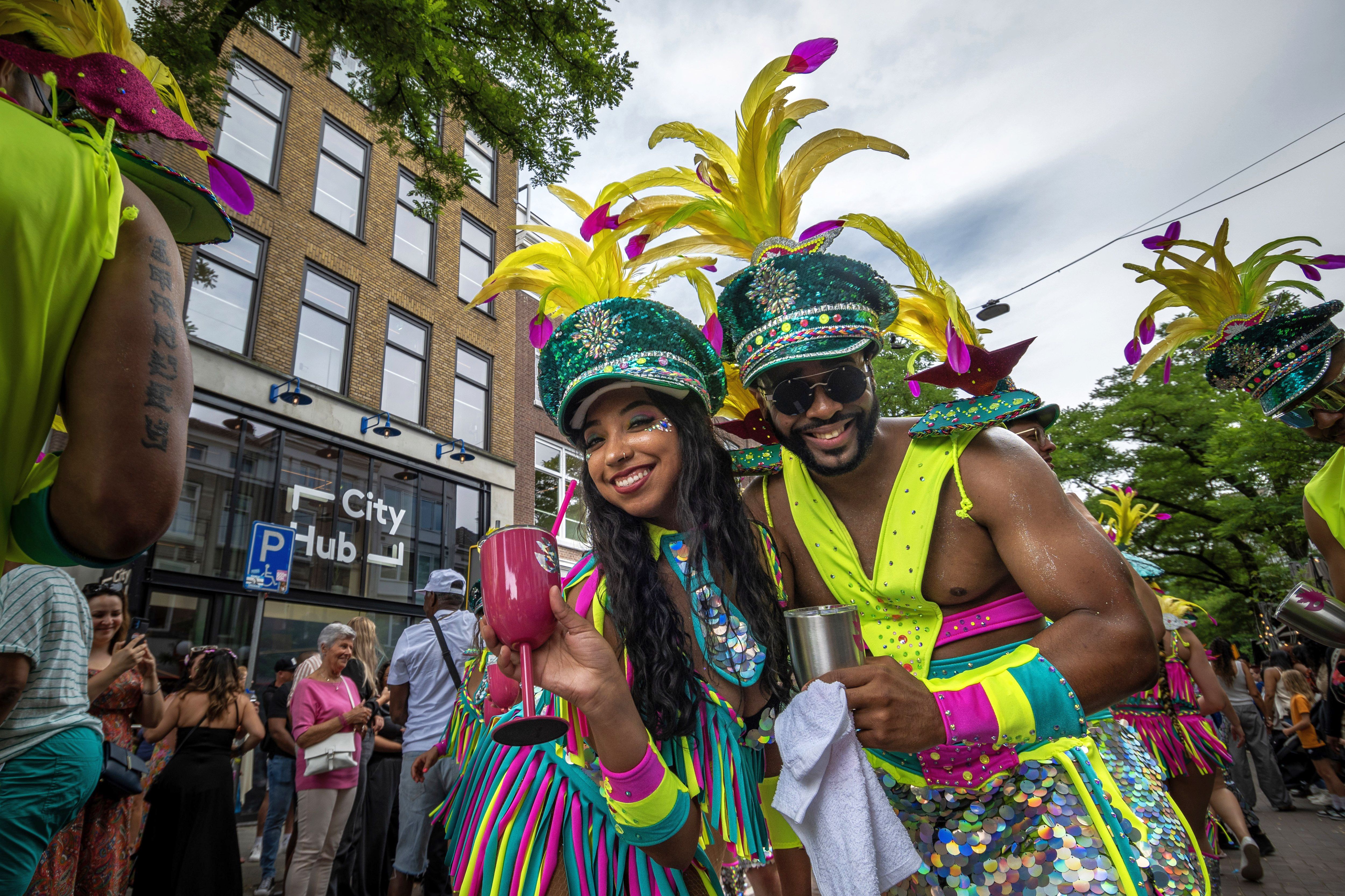 Revellers get into the spirit of the 40th annual Zomercarnaval – summer carnival – in Rotterdam on July 28, 2024. The two-day event is such in integral part of Netherlands tradition it was added to Unesco’s Intangible Cultural Heritage list last year. (Phoot by James Petermeier/ZUMA Press Wire)