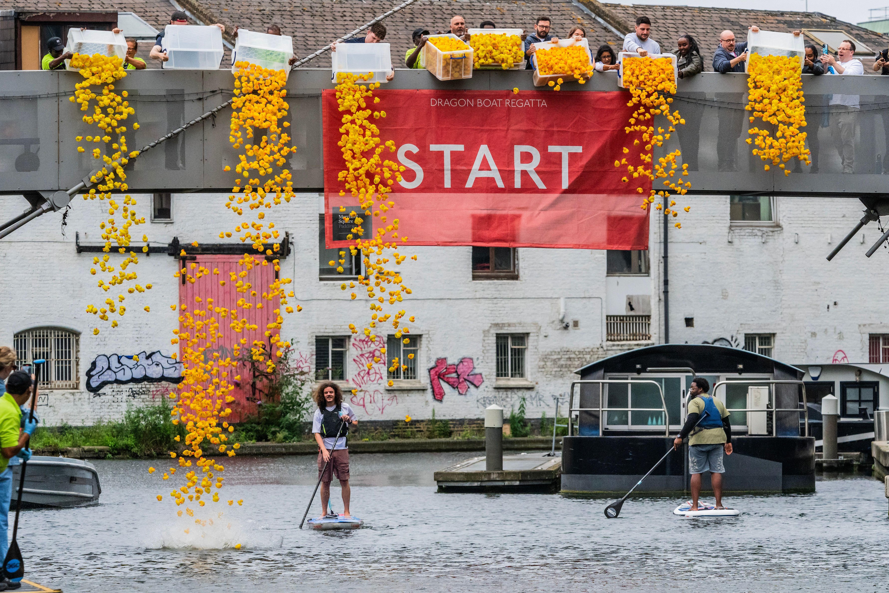 Around 3,000 rubber ducks are launched on Regent's Canal in Paddington, UK on July 25, 2024 for the annual charity rubber duck race. Now in its 17th year, the race raises money for local charity Cosmic (Children of St Mary's Intensive Care), by allowing the public to sponsor a duck for £3. The first duck to bob 100 metres to the finish line is declared the winner. (Photo by Guy Bell/Alamy Live News)