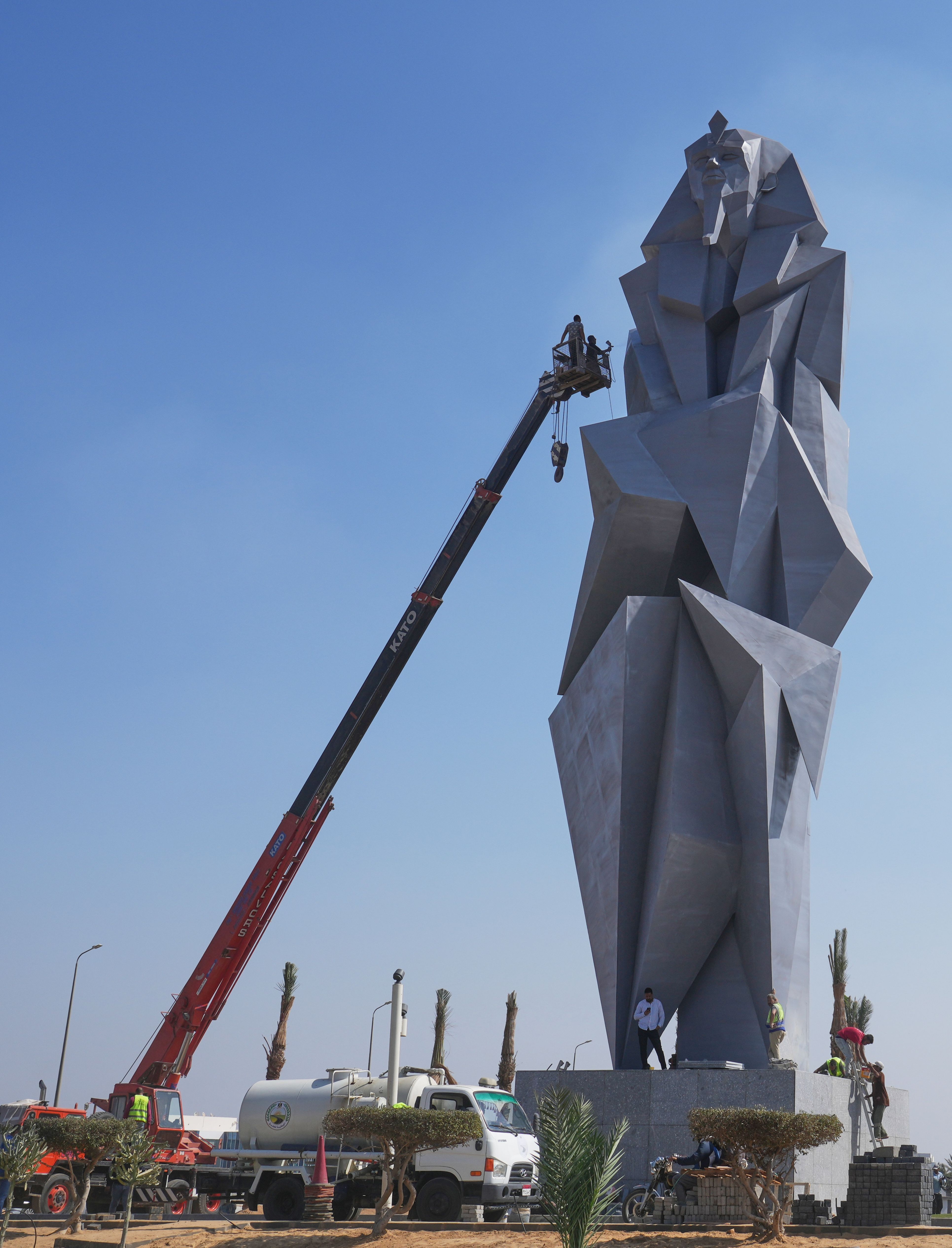 Workers paint the 27 meters (89 feet) iron statue “The guard” by Egyptian artist Deyaa Awed, which will face visitors coming from Sphinx airport to the Grand Egyptian Museum in Giza, Egypt, Tuesday, October 28, 2025. (Photo by Amr Nabil/AP Photo)