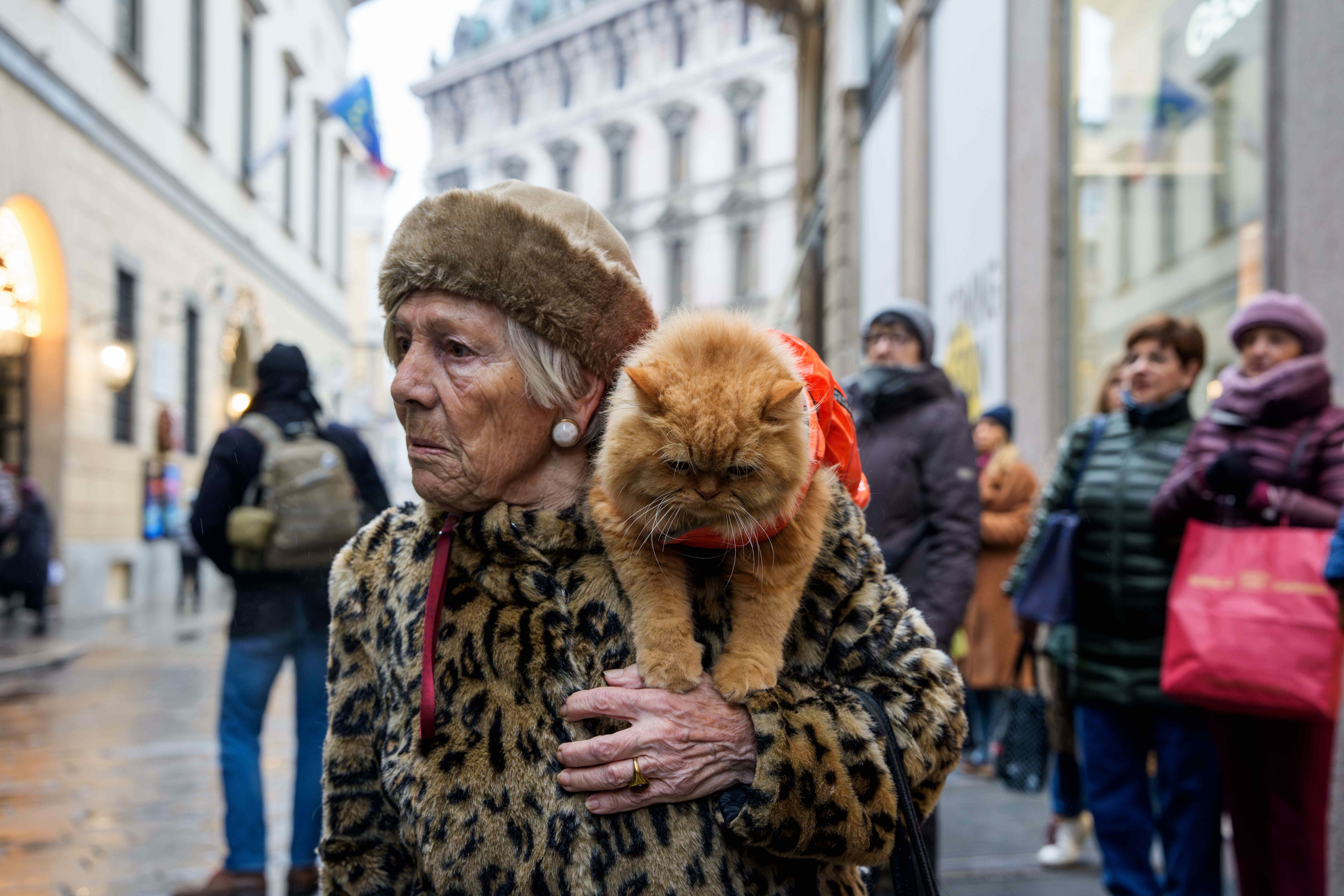 A woman with her cat at the funeral chapel for Italian singer Ornella Vanoni at the Piccolo Teatro Grassi, in Milan, Monday, November 24, 2025. (Photo by Claudio Furlan/LaPresse via AP Photo)