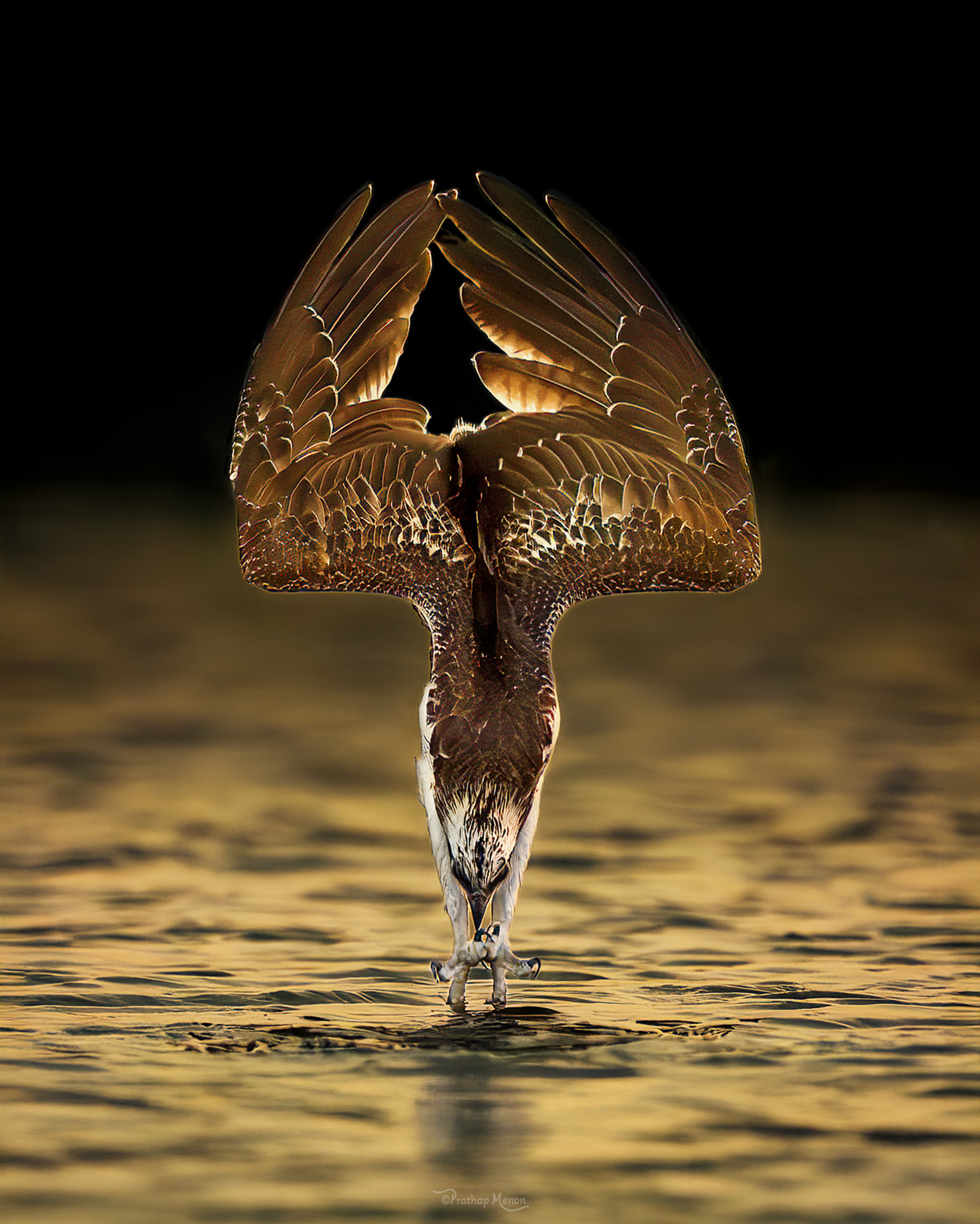 An osprey enters the water hunting for food at Al Qudra Lakes in Dubai, United Arab Emirates in the second decade of November 2025. (Photo by Prathap Menon/Two Point O Media)