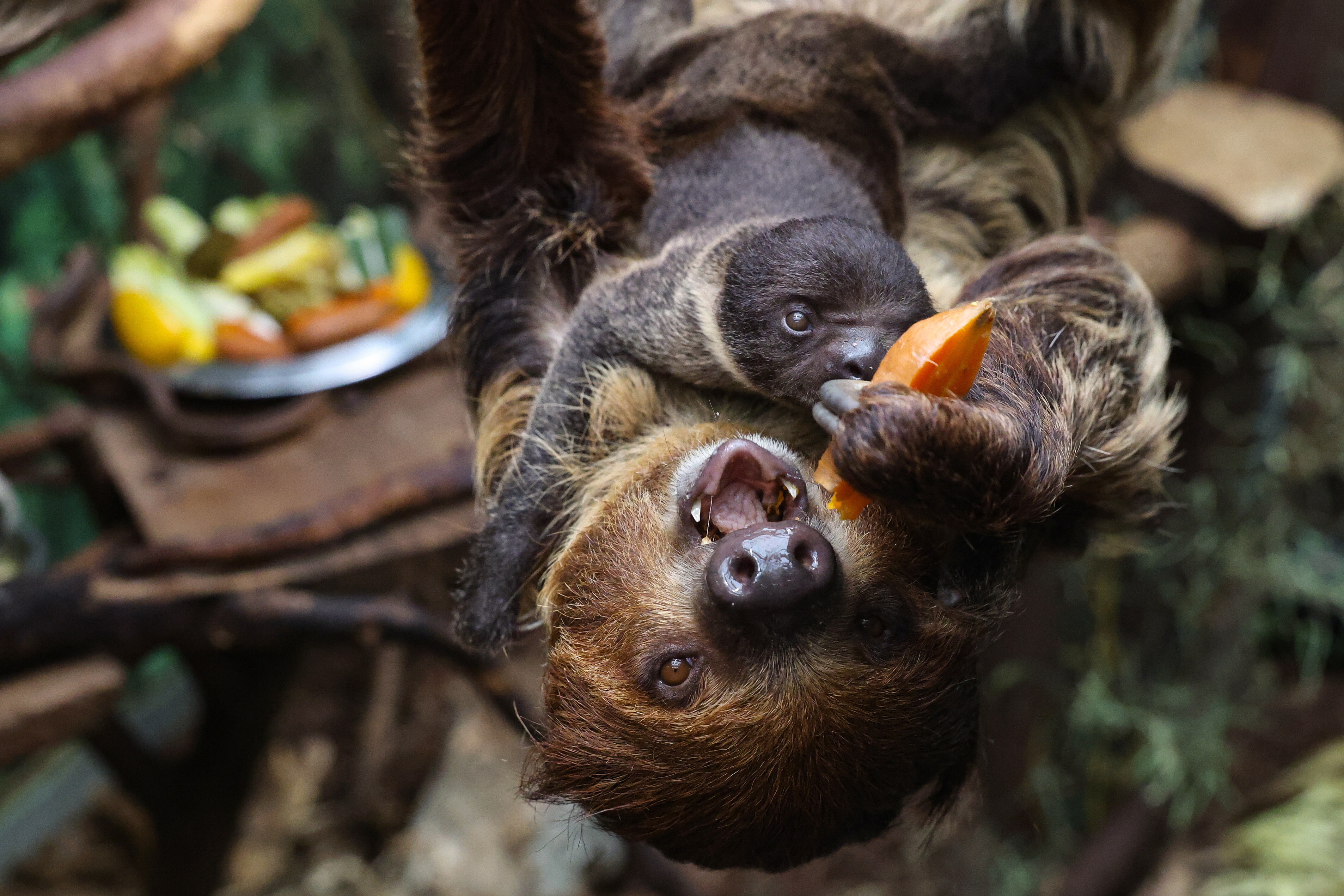 A new resident of the Lodz Zoo - a Two-toed Sloth (Choloepus didactylus) with its mother in the enclosure of the Lodz Zoo in Lodz, Poland 17 November 2025. (Photo by Marian Zubrzycki/EPA)