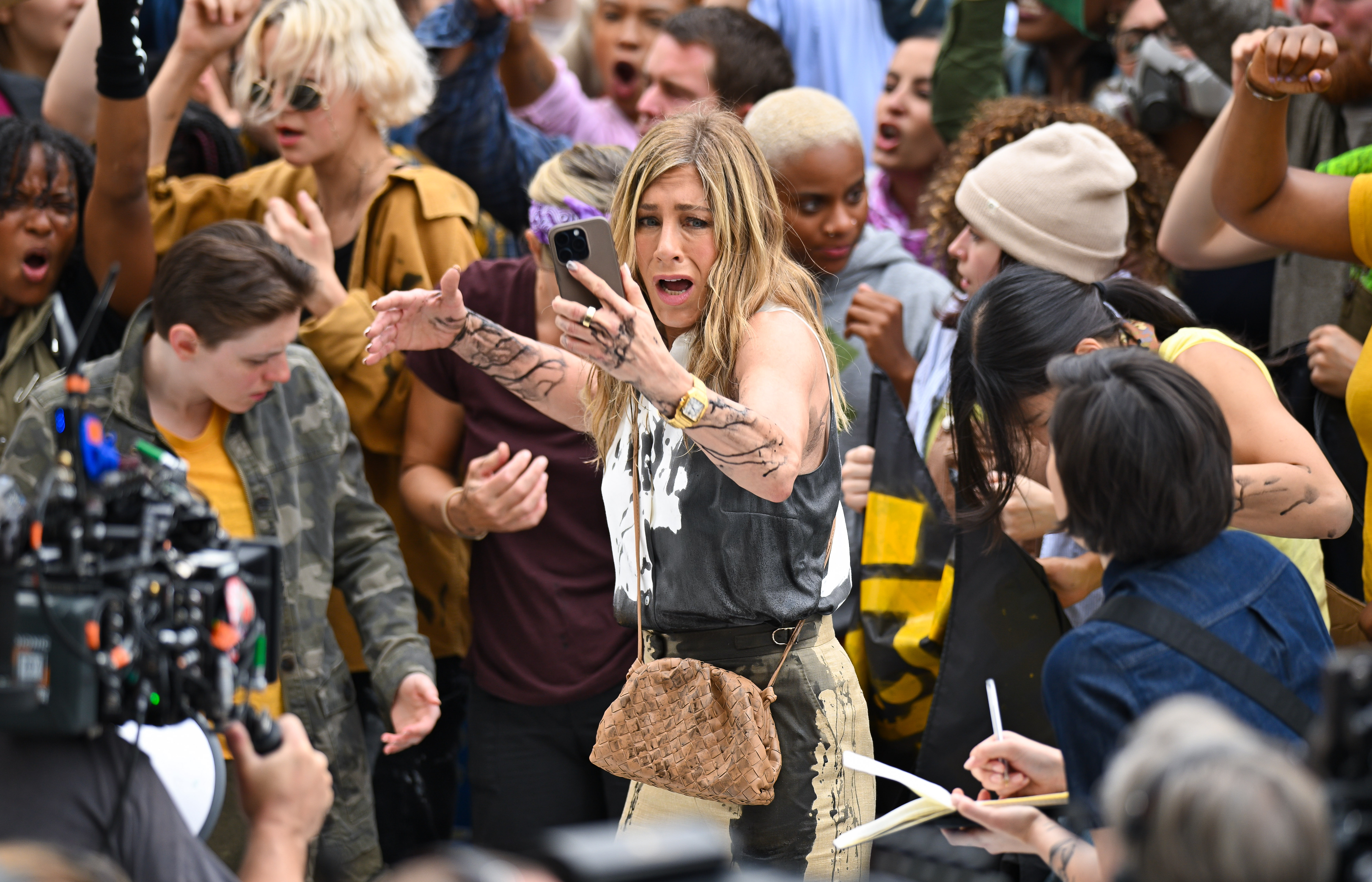 American actress Jennifer Aniston is seen filming on location for “The Morning Show” in the Flatiron District on July 28, 2024 in New York City. (Photo by James Devaney/GC Images)