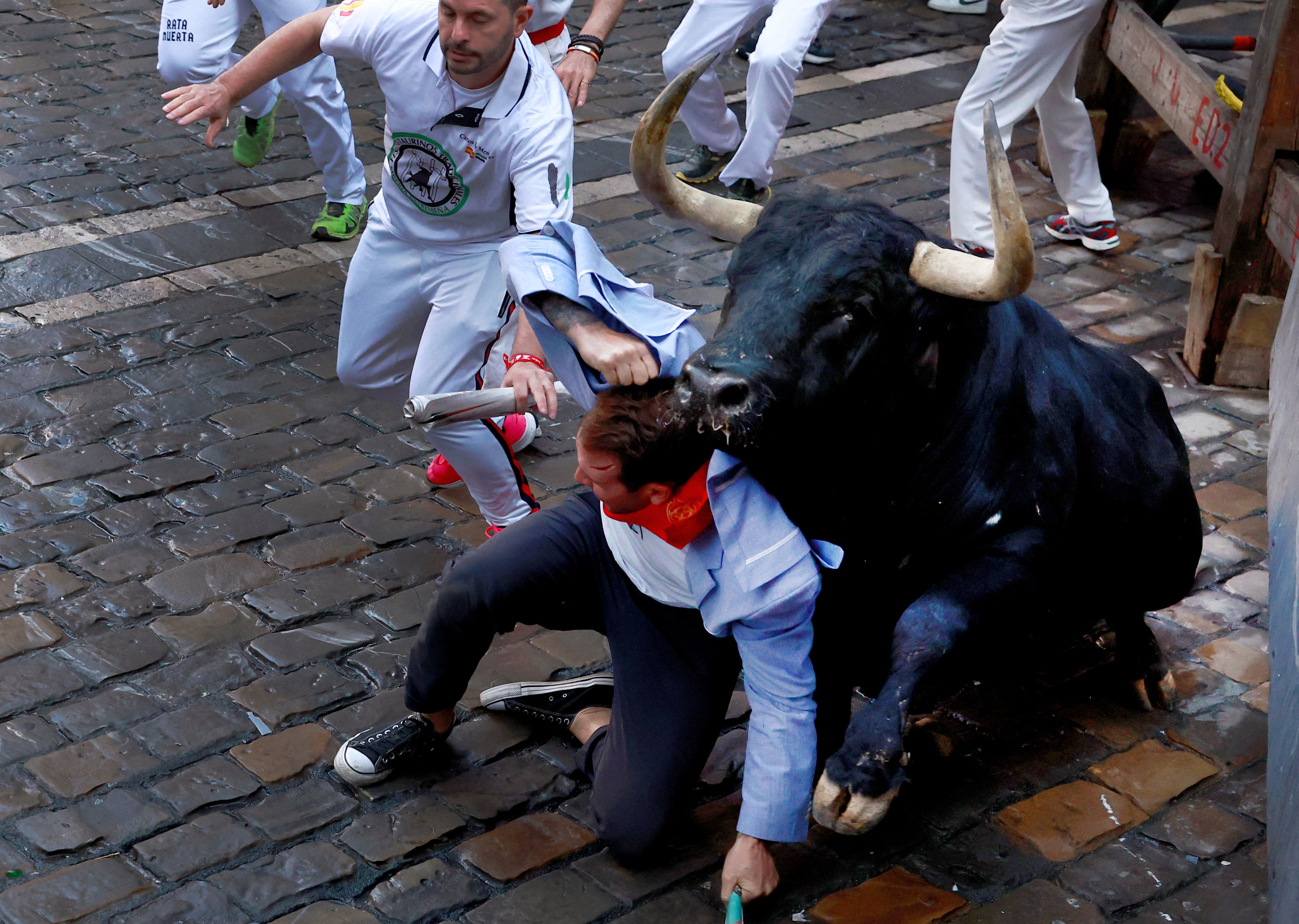 A runner falls in front of a bull, during the running of the bulls at the San Fermin festival in Pamplona, Spain on July 8, 2024. (Photo by Vincent West/Reuters)