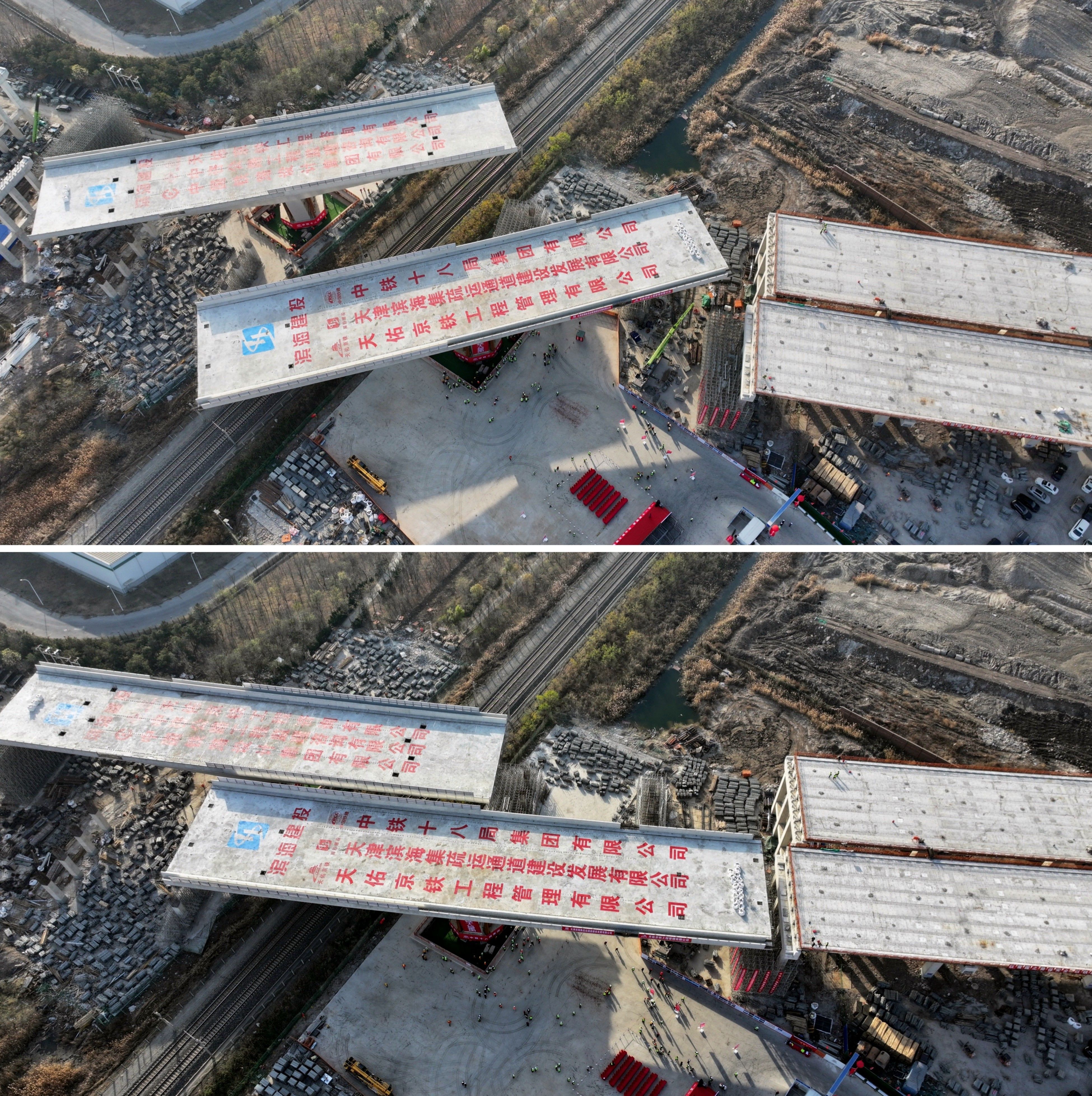 A combo photo taken with drone on Nov. 26, 2025 shows the construction site of twin swivel bridges of the Xinggang expressway in Tianjin, north China on November 26, 2025. The twin swivel bridges of the Xinggang expressway completed their rotation here on Wednesday. Two continuous beams, each weighing 14,000 tons, simultaneously turned clockwise by more than 60 degrees to pass over a railway. The Xinggang expressway is a key transportation infrastructure project in support of the coordinated development of the Beijing-Tianjin-Hebei region. (Photo by Xinhua News Agency/Rex Features/Shutterstock)