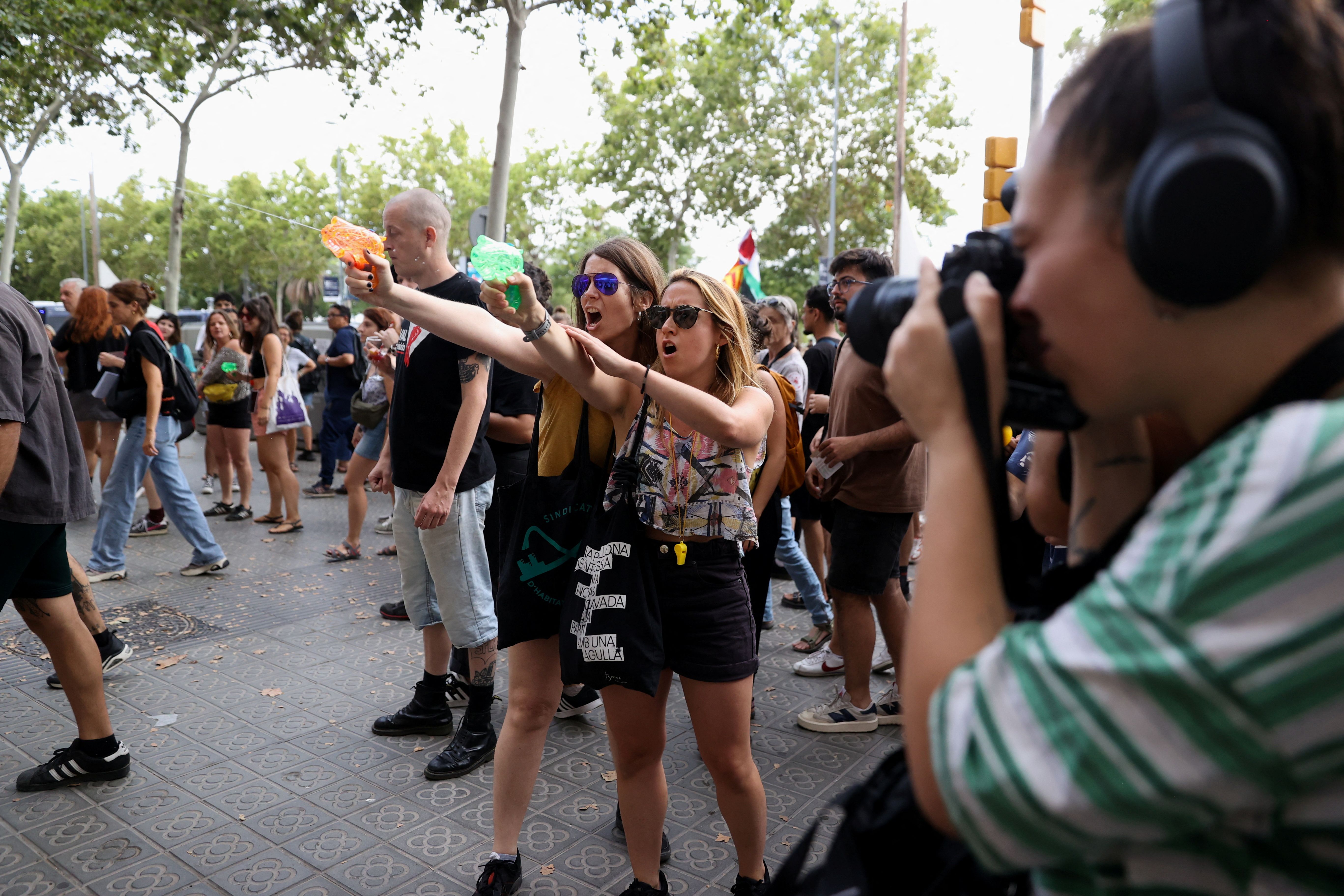 Protesters shoot water from water guns at tourists during a protest against mass tourism in Barcelona, Spain, July 6, 2024. The Catalan capital received more than 12 million tourists in 2023 and expects more in 2024. (Photo by Bruna Casas/Reuters)