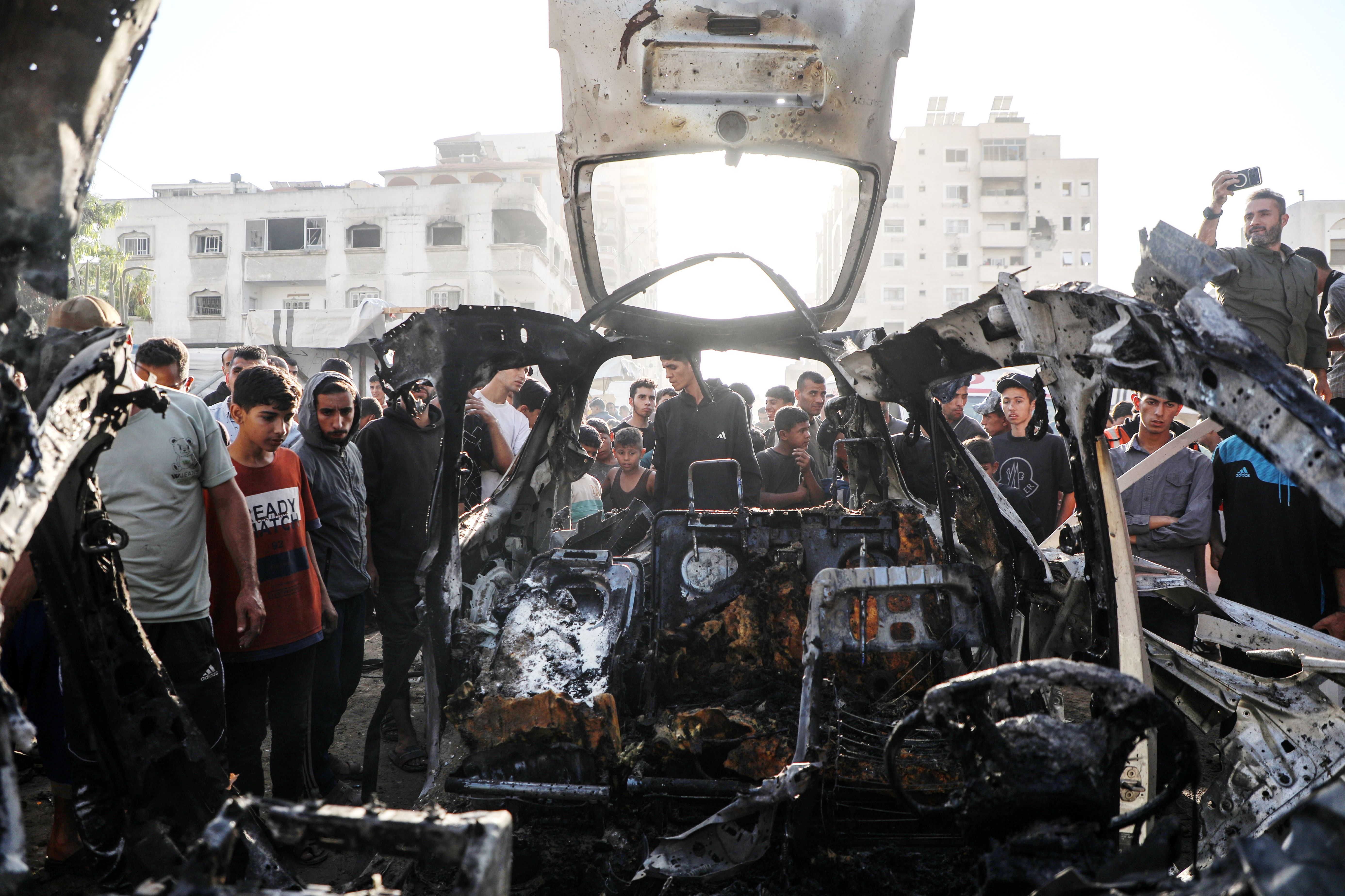 Palestinians gather around a destroyed vehicle in west of Gaza City, on November 22, 2025. Gaza's Civil Defense said on Saturday that Israel launched a series of airstrikes on the Gaza Strip, resulting in at least 22 deaths and dozens of injuries in the enclave. A Hamas source, speaking on condition of anonymity, told Xinhua that the movement has informed regional mediators of its “anger” over continued Israeli attacks on the Gaza Strip, despite Hamas and other Palestinian factions adhering to the ceasefire agreement. (Photo by Xinhua News Agency/Rex Features/Shutterstock)