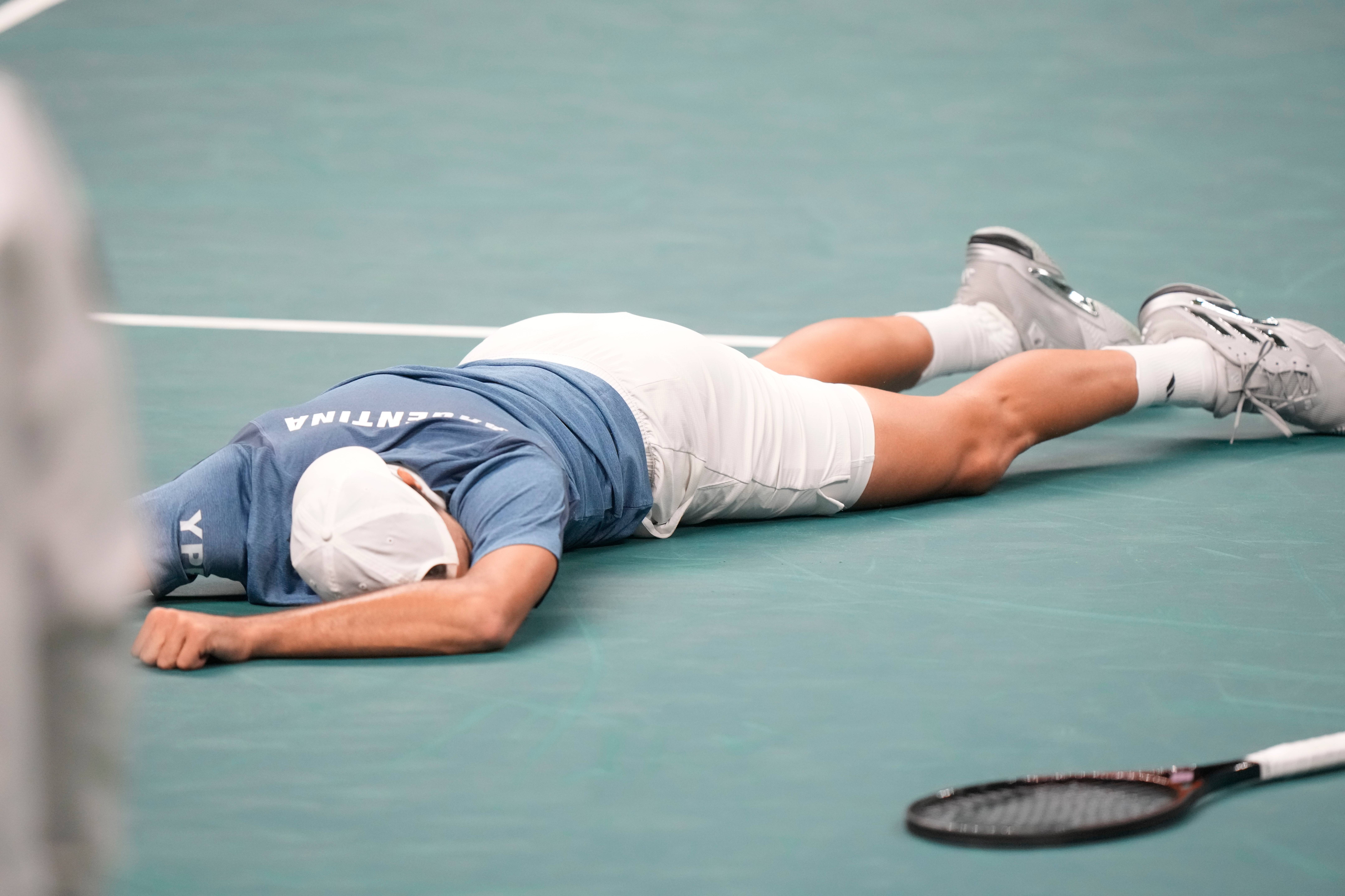 Argentina's Francisco Cerundolo flies on the ground after falling during a Davis Cup quarterfinal singles tennis match against Germany's Alexander Zverev, between Germany and Argentina, in Bologna, Italy, Thursday, November 20, 2025. (Photo by Luca Bruno/AP Photo)