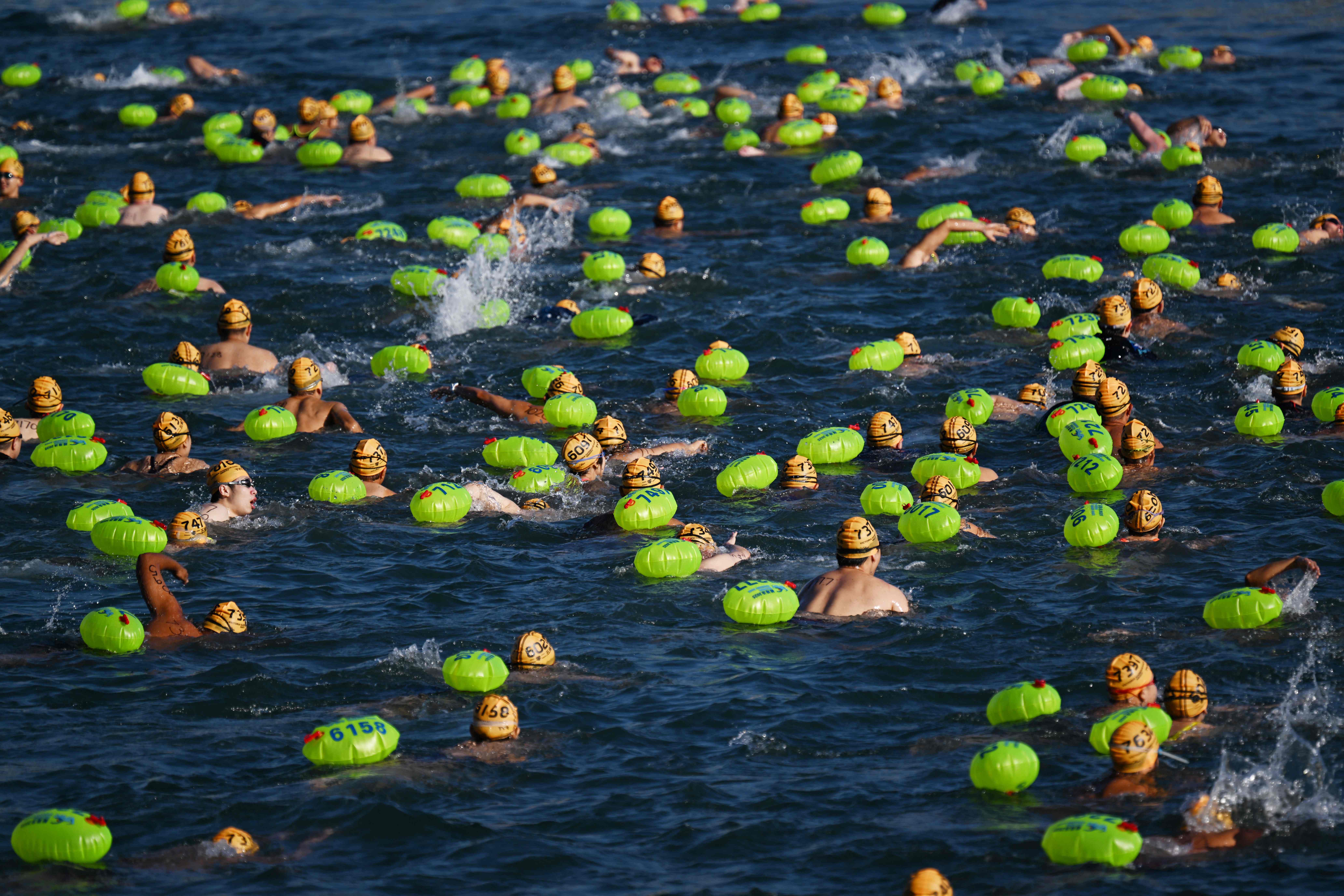 Participants take part in the Harbour Race, where swimmers cross Hong Kong's Victoria Harbour, in the city on November 22, 2025. (Photo by Peter Parks/AFP Photo)