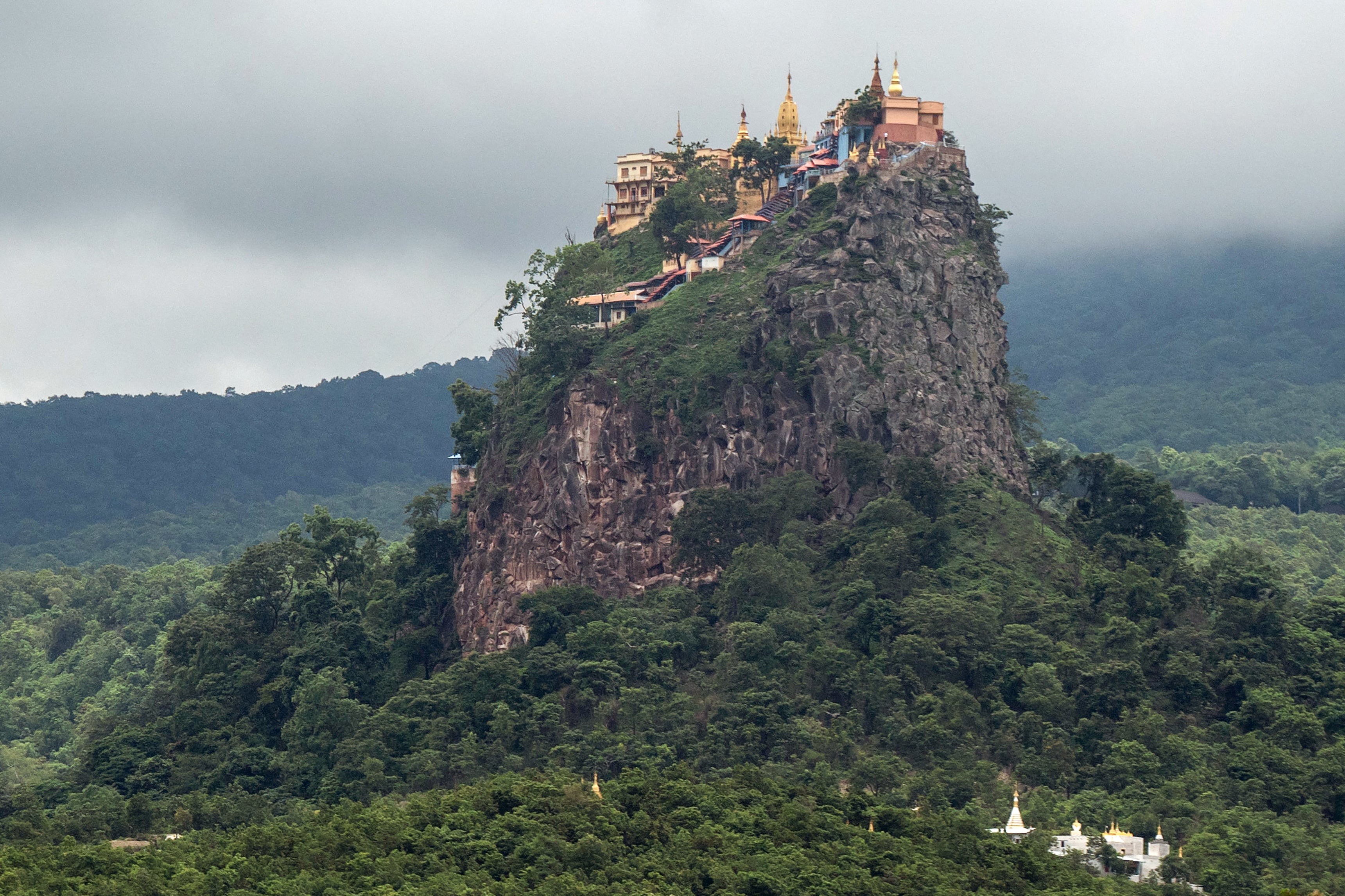 This photo taken on July 7, 2024 shows a general view of the Taung Kalat Buddhist complex on Mount Popa in central Myanmar's Mandalay Region. A shrine perched on an extinct volcano in Myanmar once thronged with the bustle of pilgrims praying to flower-eating spirit Popa Maedaw, but civil war has cut the complex off from the faithful. Now, the prayers have fallen silent at the Taung Kalat shrine, the plains around it a battle zone and the faithful mostly blocked from access by fighting and checkpoints manned by all sides in the conflict. (Photo by Sai Aung Main/AFP Photo)