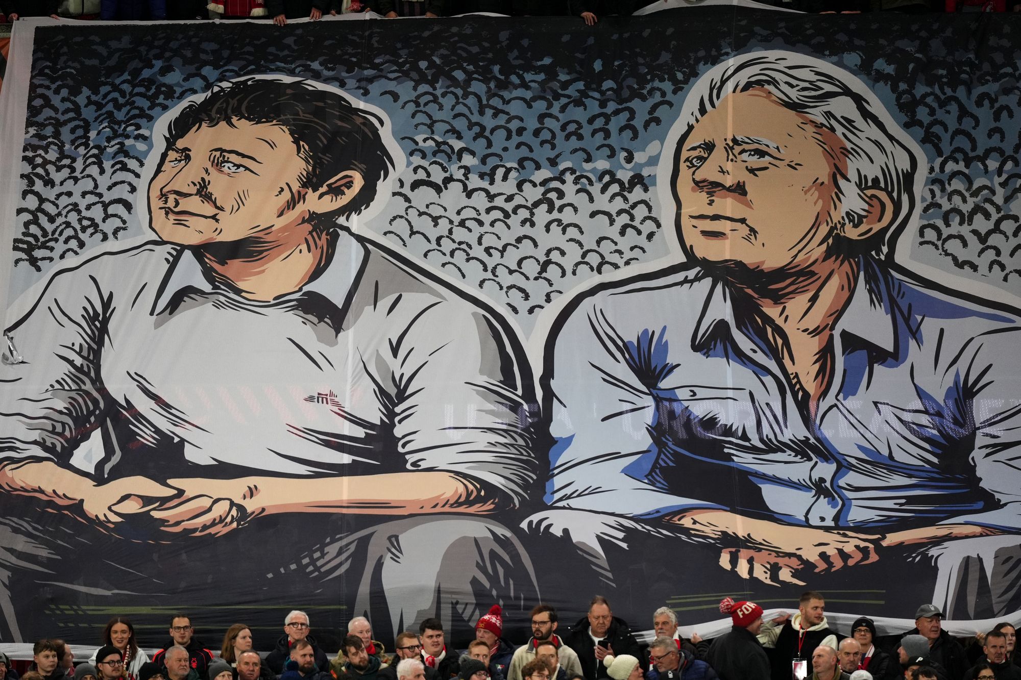 A banner of former Nottingham Forest manager Brian Clough (left) with assistant Peter Taylor before the UEFA Europa League, league phase match at the City Ground, Nottingham, UK on Thursday, November 27, 2025. (Photo by Mike Egerton/PA Images via Getty Images)