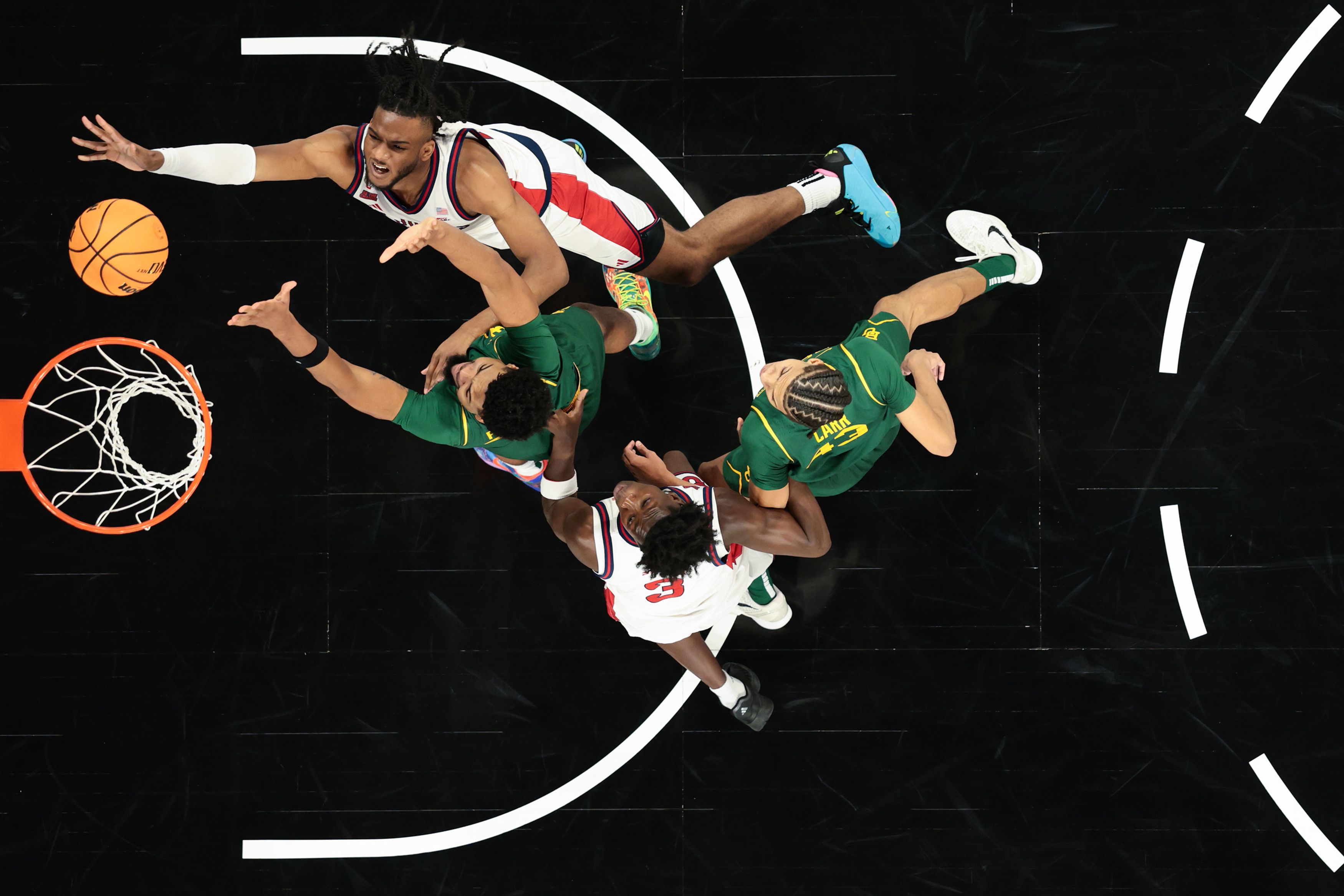 St. John’s forward Zuby Ejiofor, top, attempts a shot against Baylor during a college basketball game in Las Vegas on Tuesday, November 25, 2025. (Photo by Katelyn Mulcahy/Players Era/Getty Images)