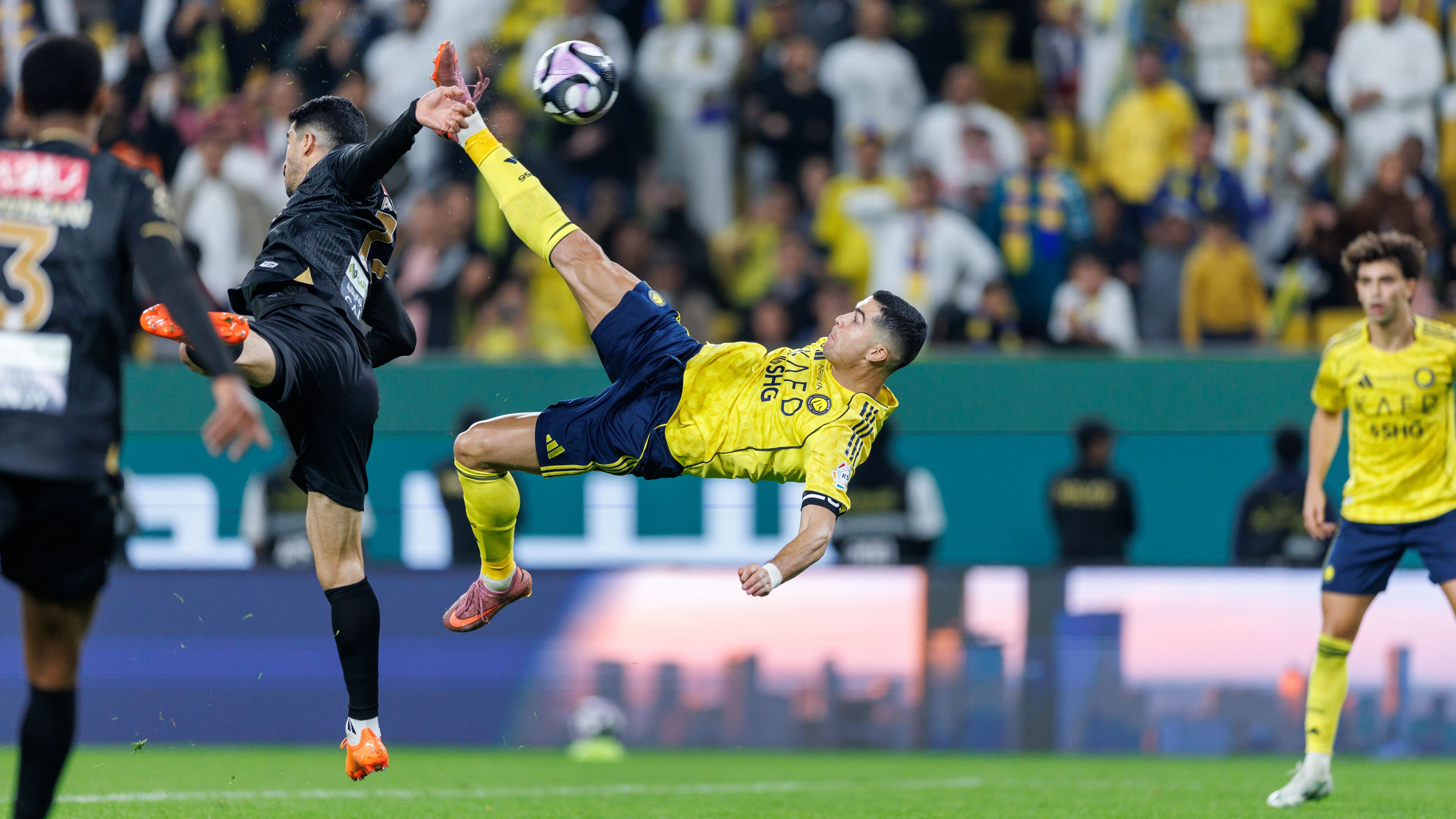 Cristiano Ronaldo of team Al-Nassr FC scores their fourth goal during the Saudi Pro League match between Al Nassr and Al Khaleej at Al Awwal Park on November 23, 2025 in Riyadh, Saudi Arabia. (Photo by Abdullah Ahmed/Getty Images)