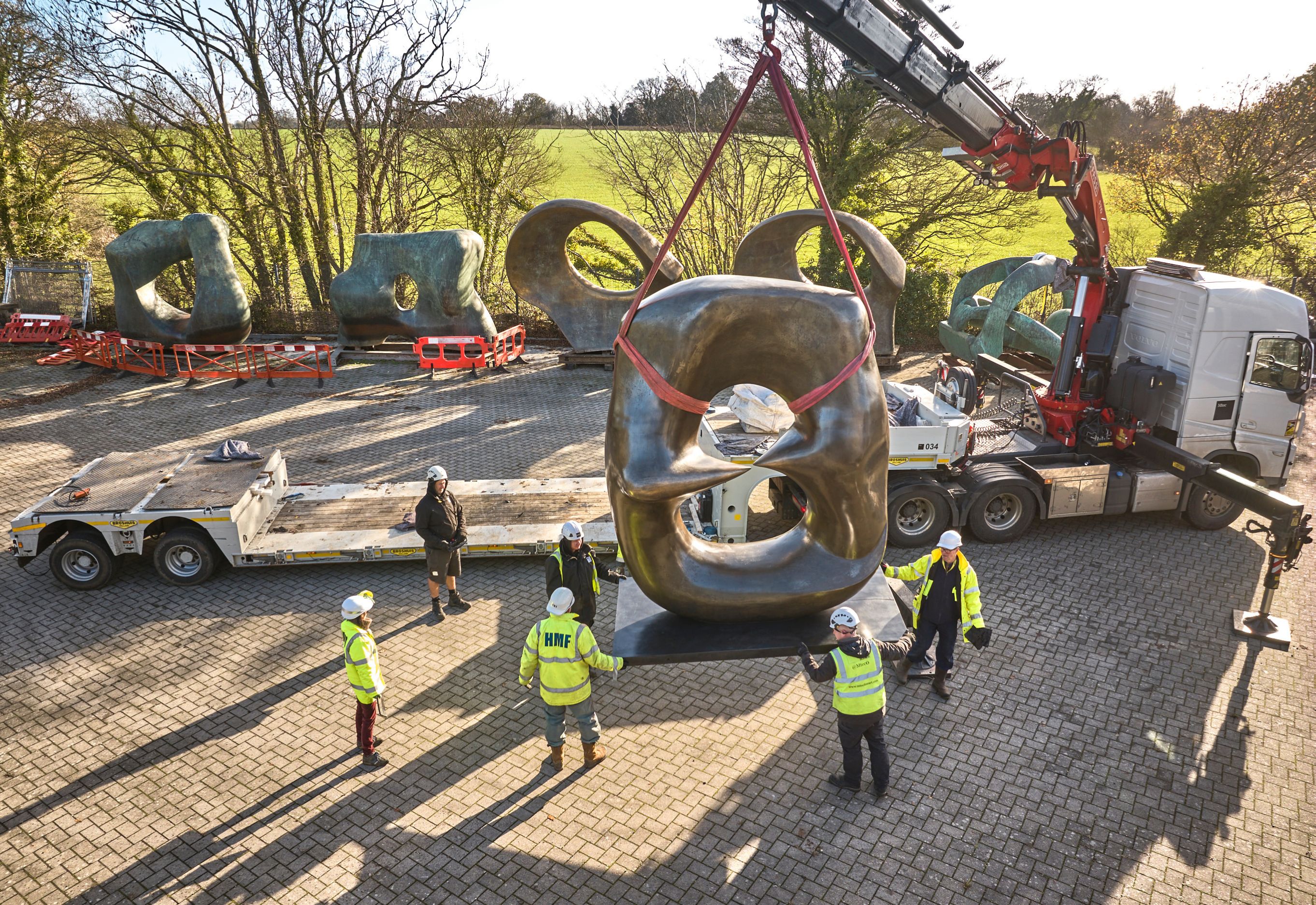 Henry Moore’s Oval with Points is moved from its Hertfordshire home for conservation before taking centre stage in a landmark exhibition at Kew Gardens, England in the second decade of November 2025. (Photo by David Levene/The Guardian)