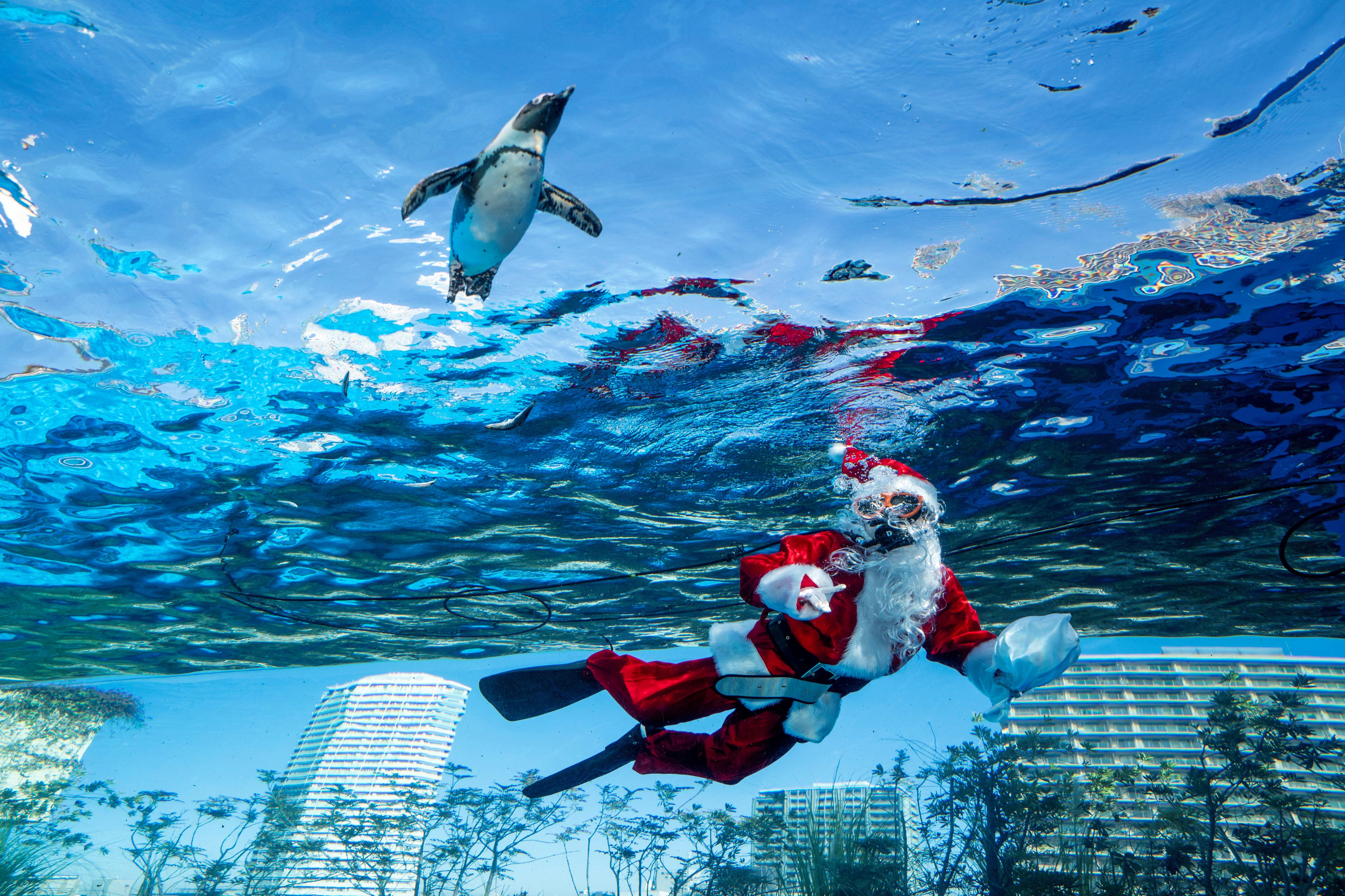 A diver dressed in a Santa Claus costume swims with a penguin at Sunshine Aquarium during preparations for the upcoming Christmas special event in Tokyo on December 1, 2025. (Photo by Kazuhiro Nogi/AFP via Getty Images)