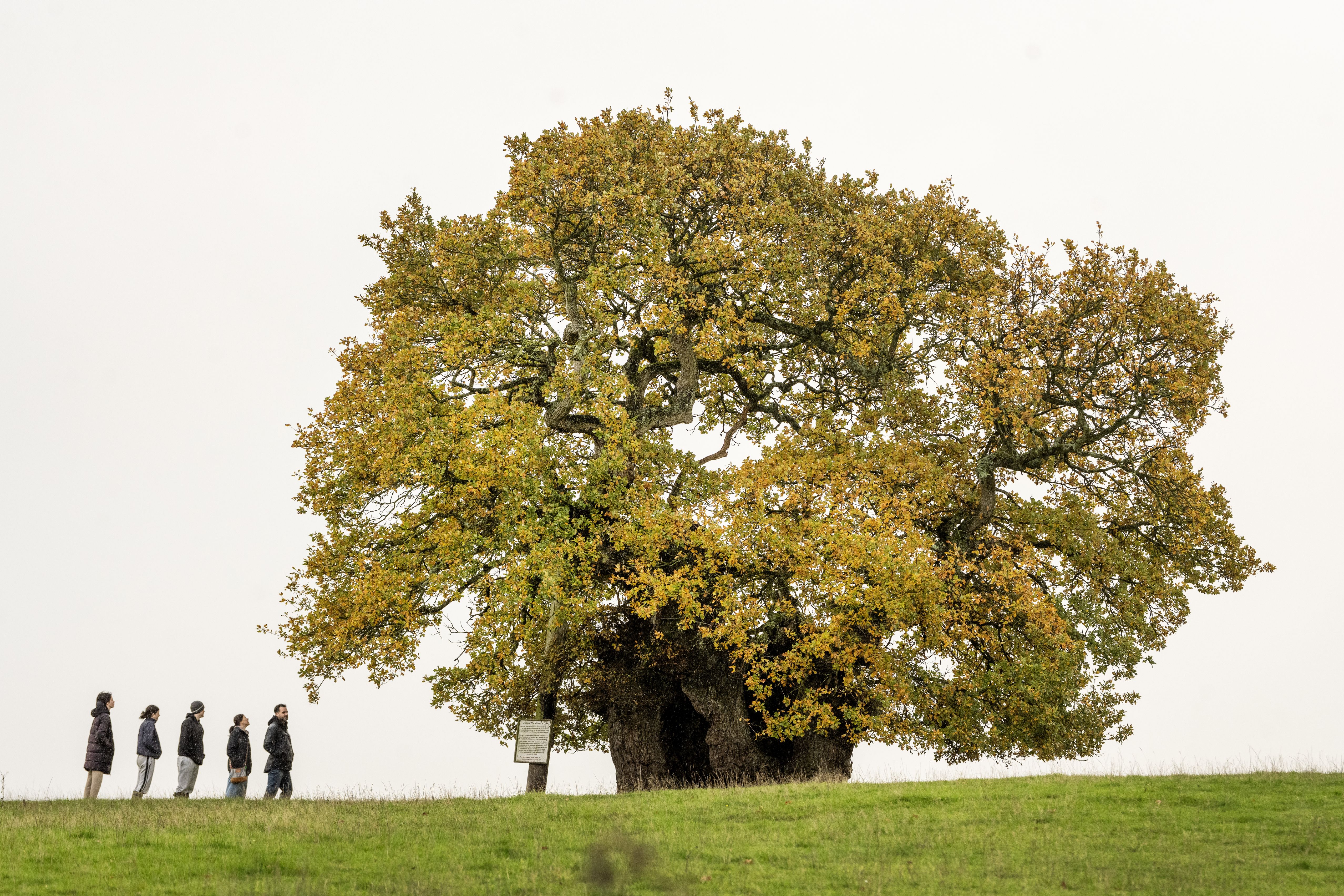 A family in Dorset admire the autumnal colours of a 1000 year old oak tree in Dorset, UK on November 3, 2025. Tourists come from all over the UK and Europe to the see the tree called, “Judge Wyndham's Oak” in the small hamlet of Silton. It's named after Judge Hugh Wyndham. He was a Judge for Charles I, Charles Il and Oliver Cromwell and was one of the Judges who presided over the courts in the aftermath of the Great Fire of London in 1666. His home was in Silton and it's said he used to sit under the old oak tree. (Photo by ZacharyCulpin/Bournemouth News)