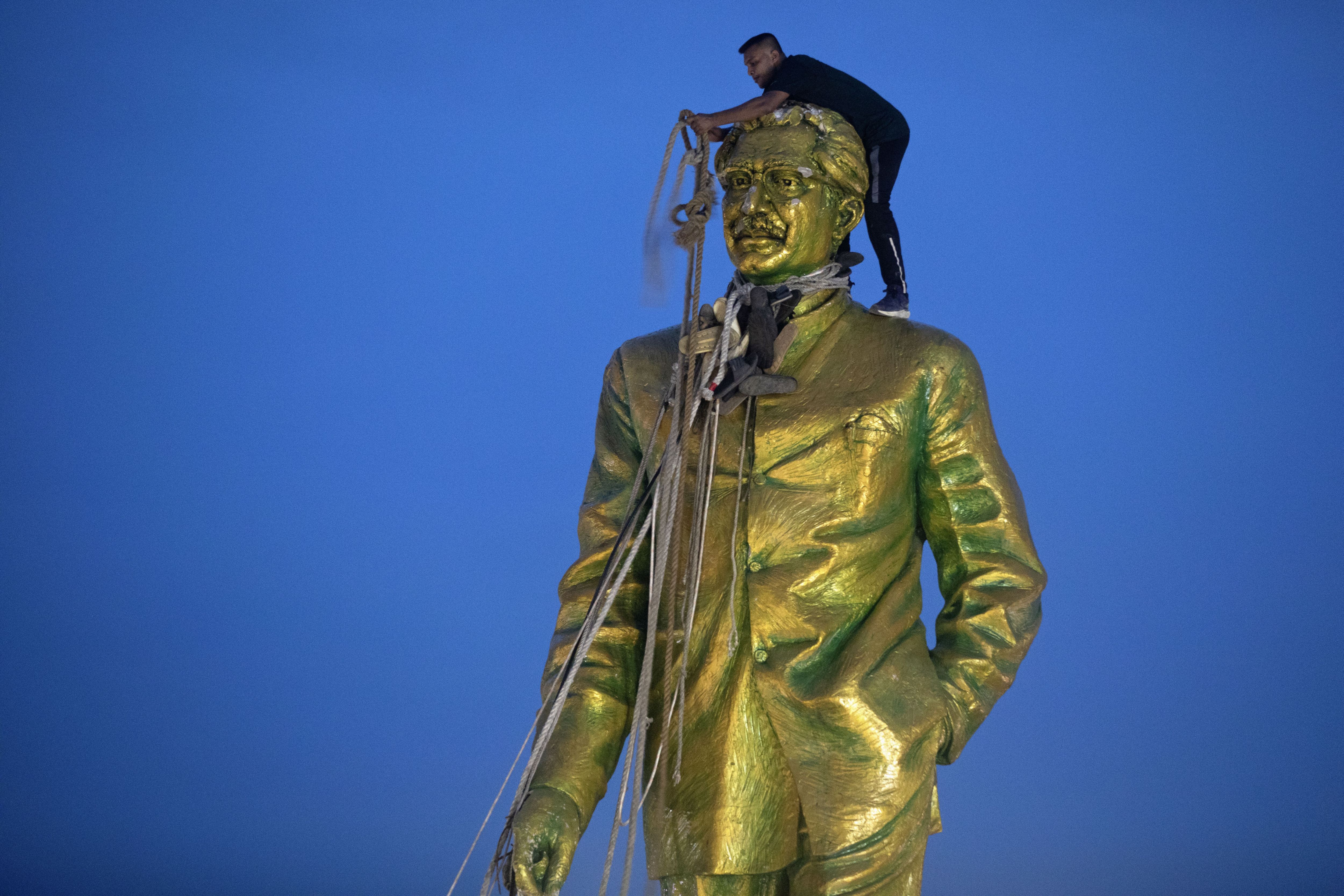 A man climbs to tie a rope around the head of a large statue of Sheikh Mujibur Rahman, father of Bangladesh leader Sheikh Hasina, as protesters try to bring it down after she resigned as Prime Minister, in Dhaka, Bangladesh, Monday, August 5, 2024. (Photo by Rajib Dhar/AP Photo)