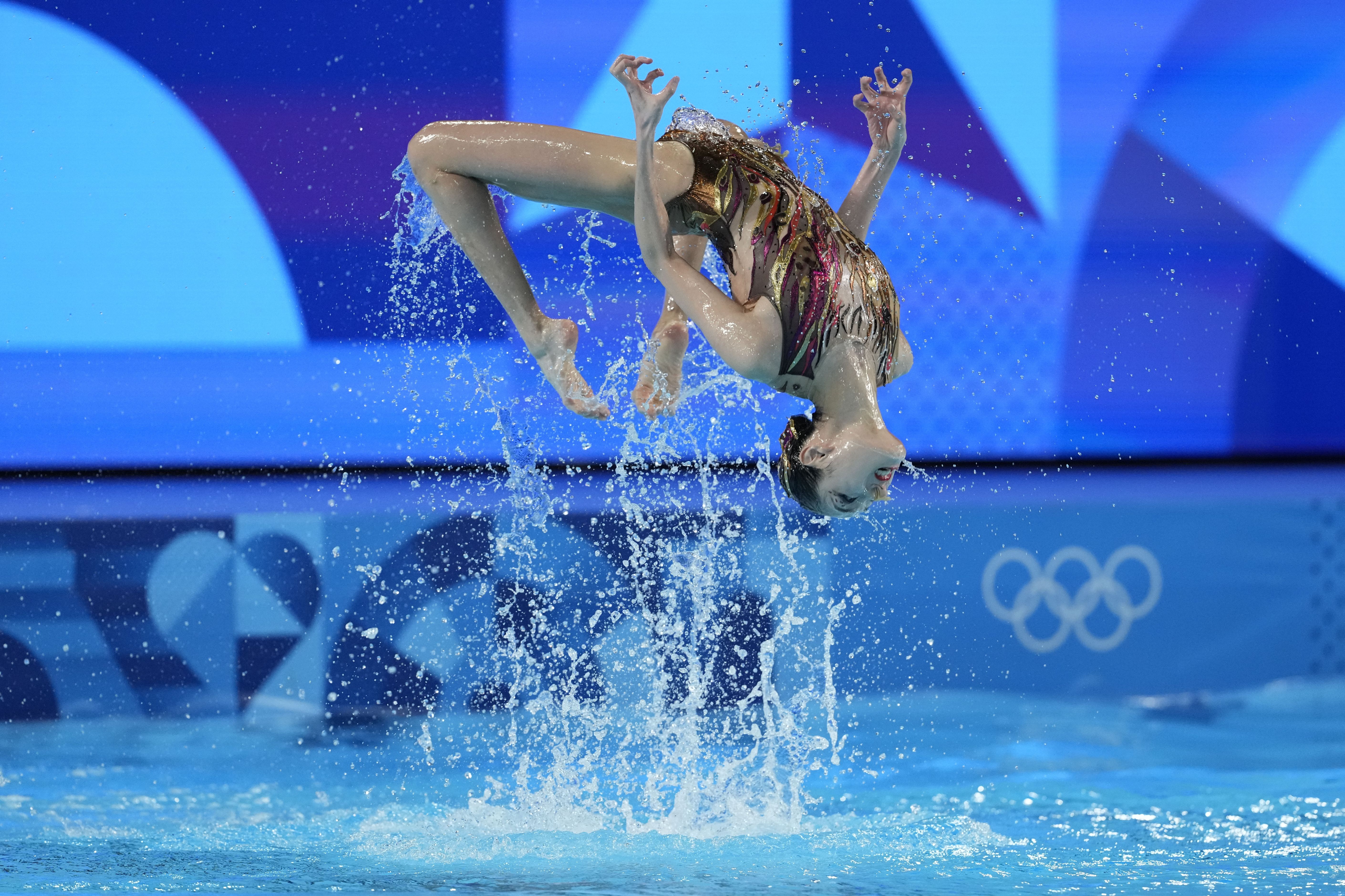 China's Wang Liuyi and Wang Qianyi, compete in the duet free routine of artistic swimming at the 2024 Summer Olympics, Saturday, August 10, 2024, in Saint-Denis, France. (Photo by Lee Jin-man/AP Photo)