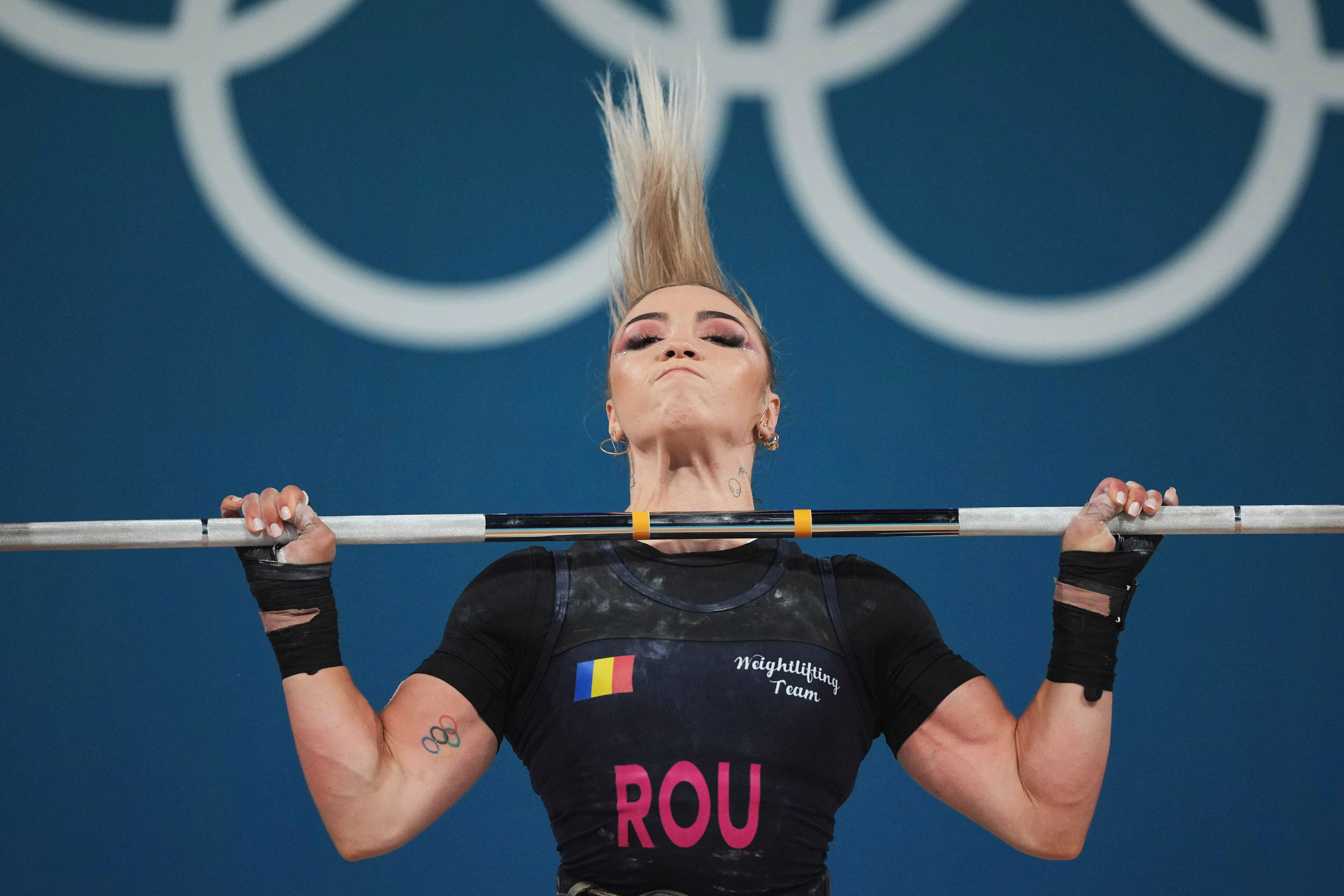 Michaela Valentina Cambei of Romania competes during the women's 49kg weightlifting event at the 2024 Summer Olympics, Wednesday, August 7, 2024, in Paris, France. (Photo by Kin Cheung/AP Photo)