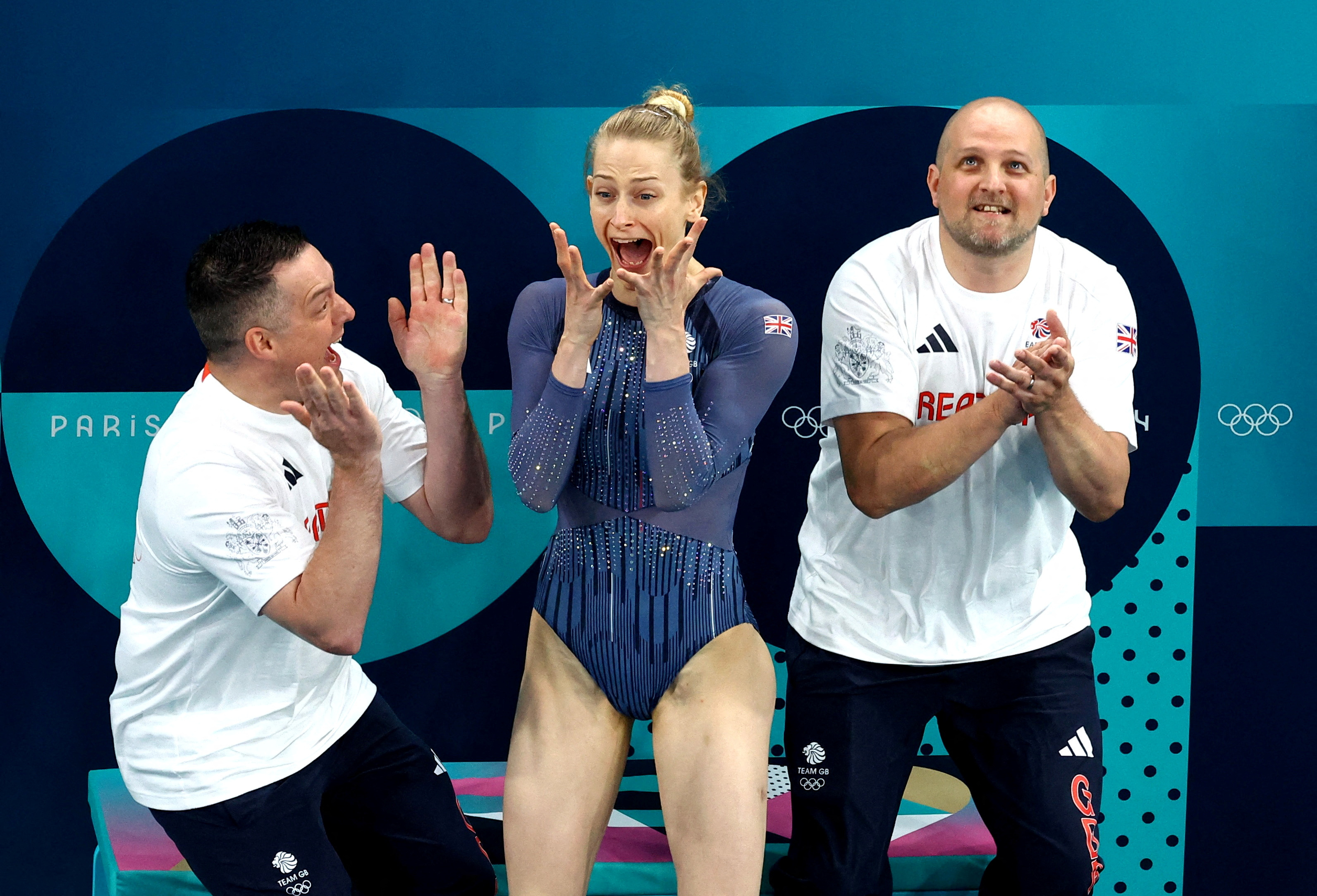 Bryony Page of Great Britain celebrates winning gold during the women’s trampoline final at Bercy Arena in Paris, France on August 02, 2024. (Photo by Athit Perawongmetha/Reuters)