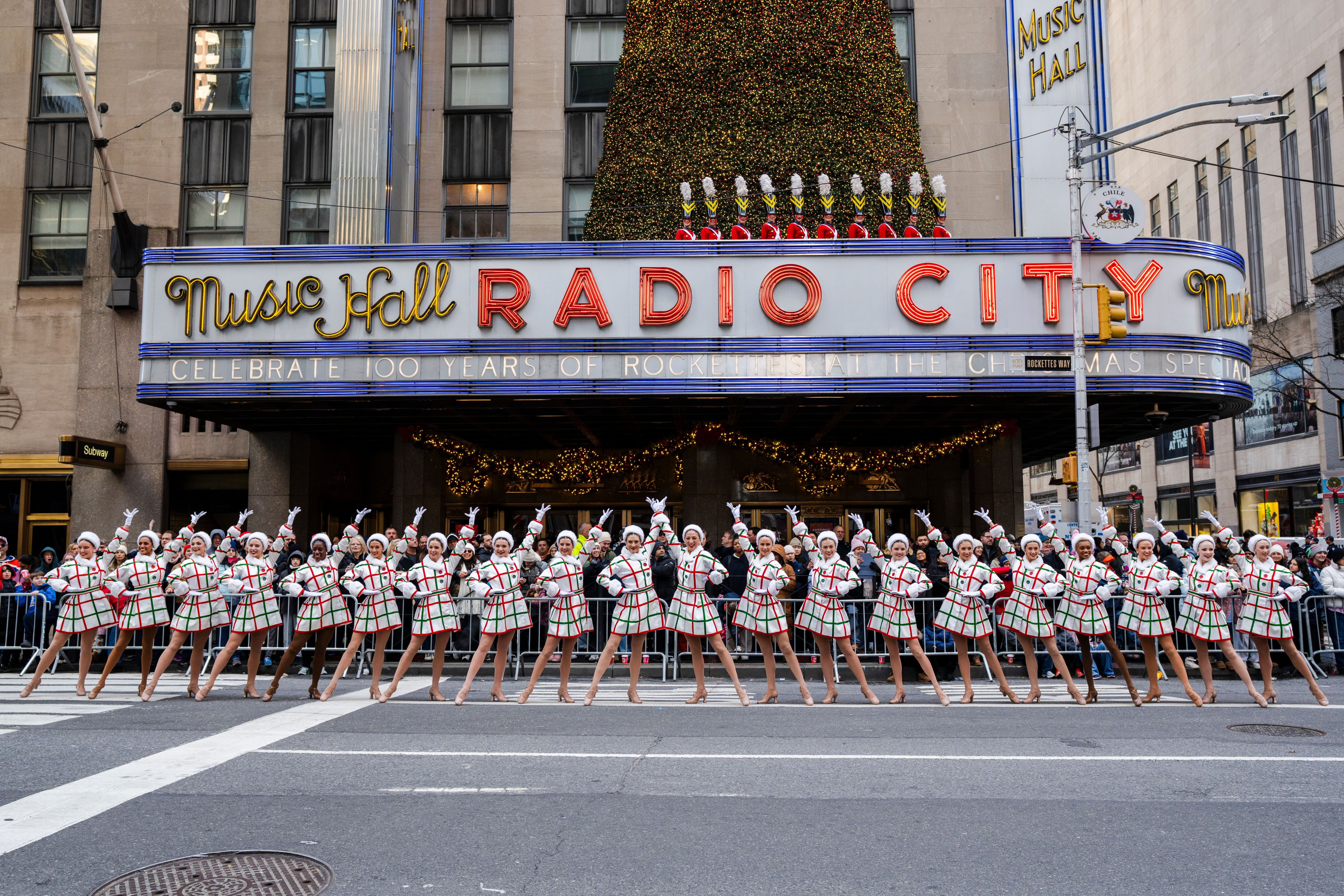 A view of the Rockettes posing in front of Radio City Music Hall during the Macy's Thanksgiving Day Parade on November 27, 2025 in New York City. (Photo by Craig T Fruchtman/Getty Images)