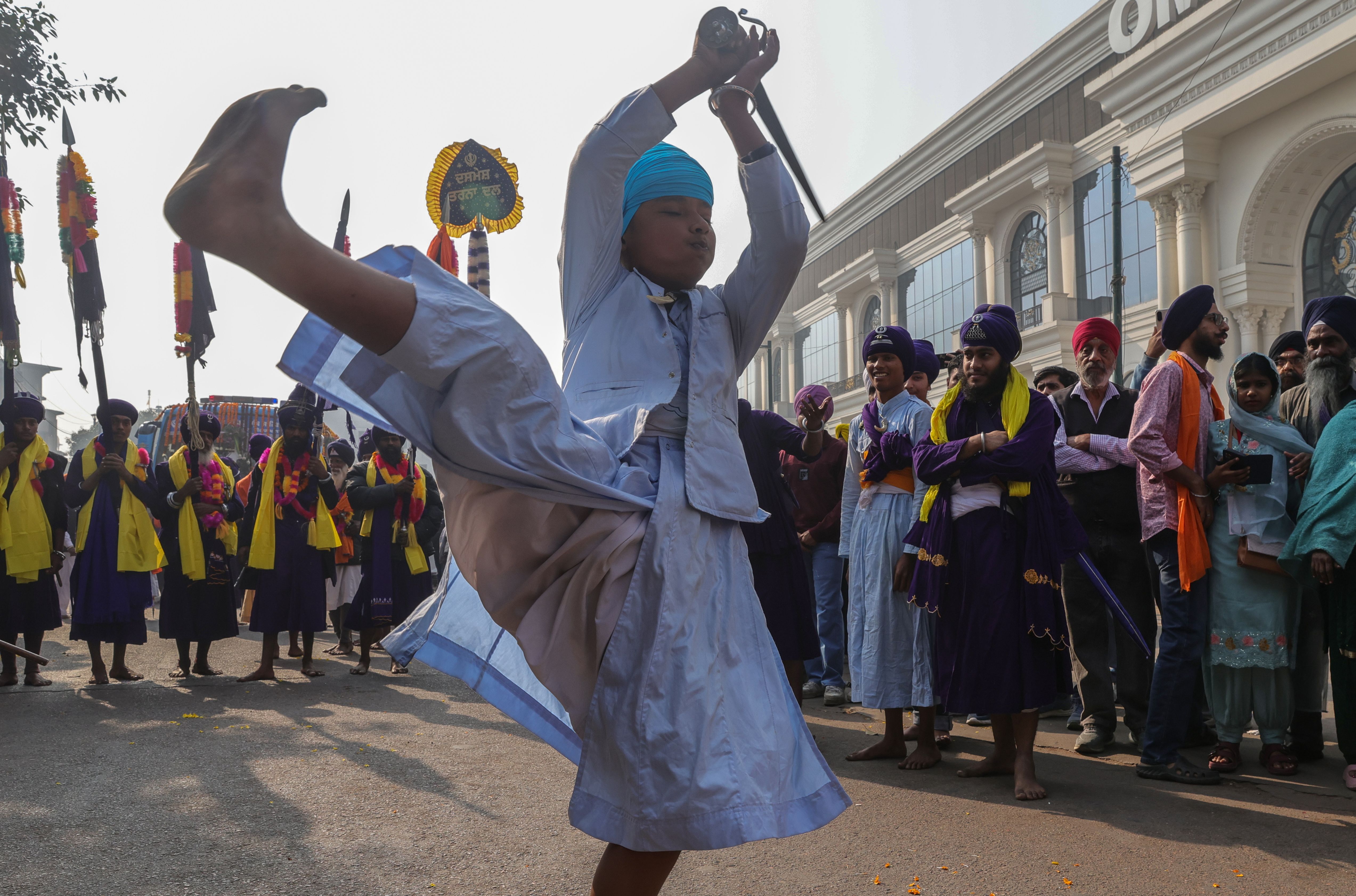 A Nihang Sikh, belonging to the Sikh warrior clan, performs Gatka, a form of Sikh martial arts, during a religious procession marking the 350th martyrdom anniversary of Guru Tegh Bahadur Ji in New Delhi, India, 25 November 2025. The procession commemorates the martyrdom of the 9th Sikh Guru, Sri Guru Tegh Bahadur Ji, who was executed in 1675 AD for refusing to convert to Islam on the orders of Mughal Emperor Aurangzeb. The event is observed at Gurudwara Sis Ganj in Delhi. Guru Tegh Bahadur, the youngest of the five sons of Guru Hargobind, was born in Amritsar in 1621. (Photo by Rajat Gupta/EPA)