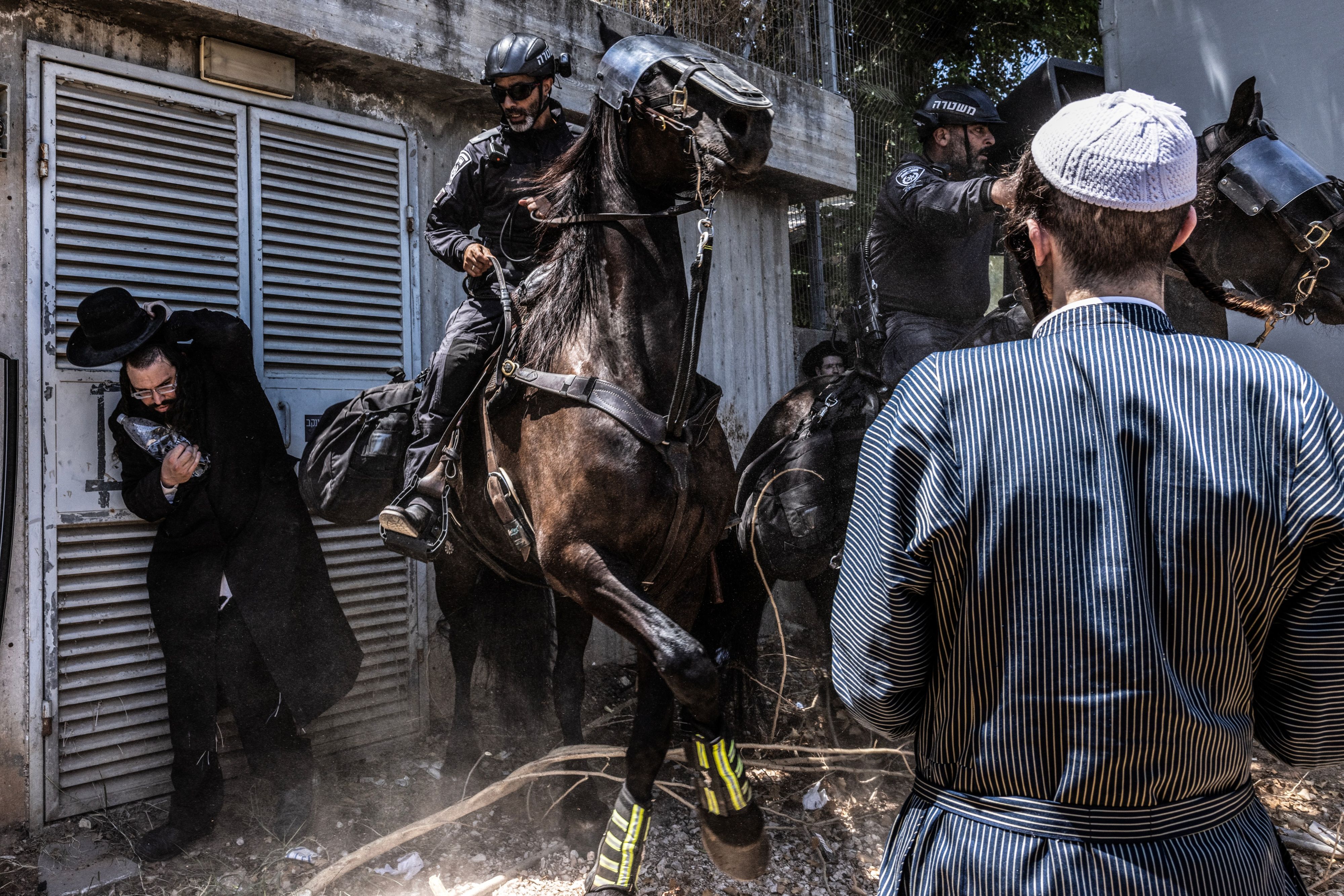 Ultra-Orthodox men clash with police at the Tel Hashomer military recruitment office in Kiryat Uno, Israel on August 5, 2024, as they protest the start of the military draft for members of the Haredi community. (Photo by Heidi Levine for The Washington Post)